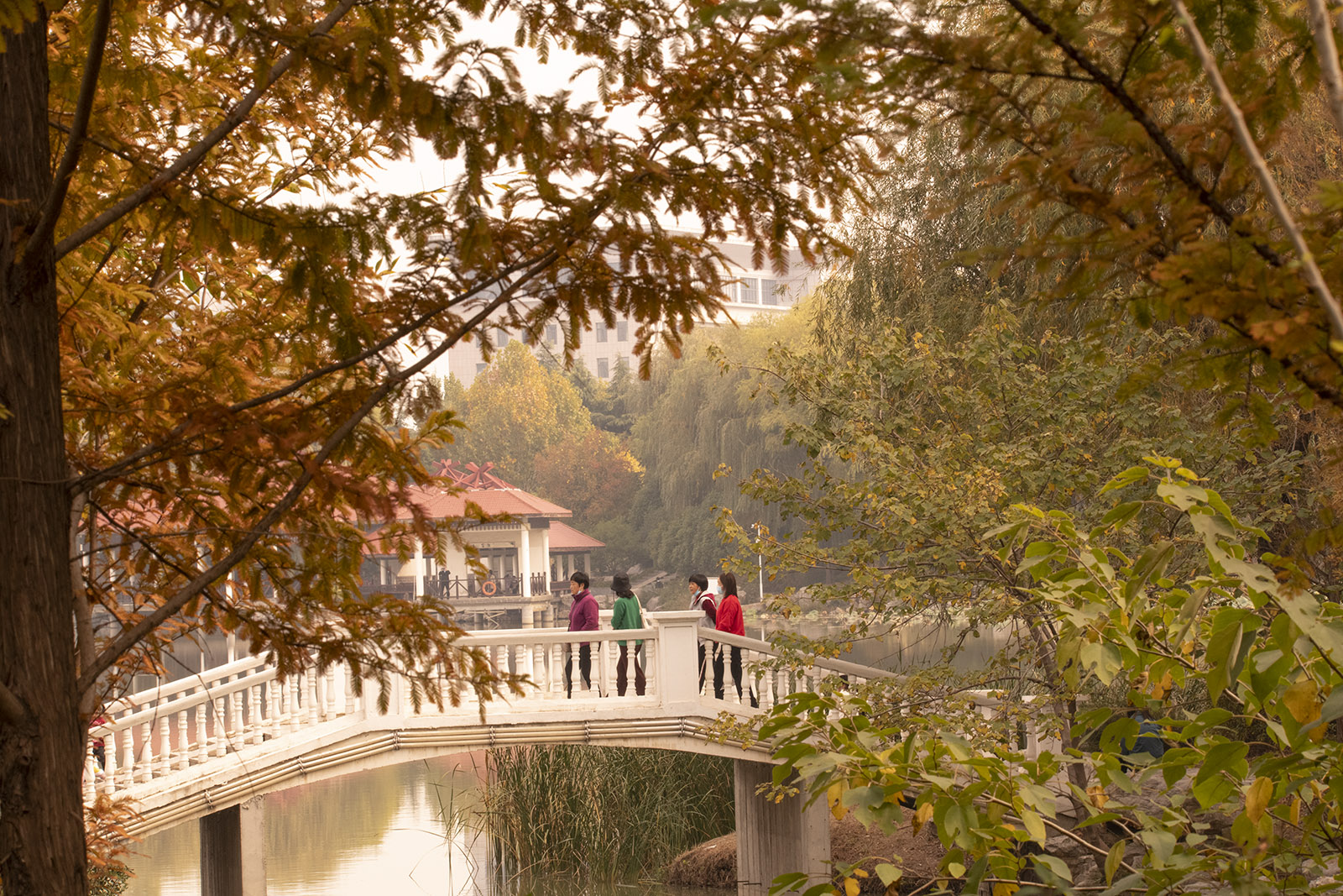 秋意浓浓,人们走在周口公园桥上欣赏风景