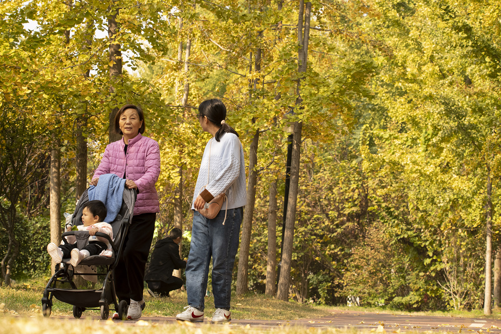 人们徜徉在周口经济开发区人民广场的银杏树林里