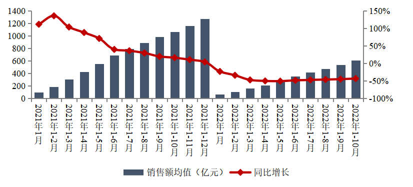 图:2021年至2022年1-10月TOP100房企累计销售额及增速情况