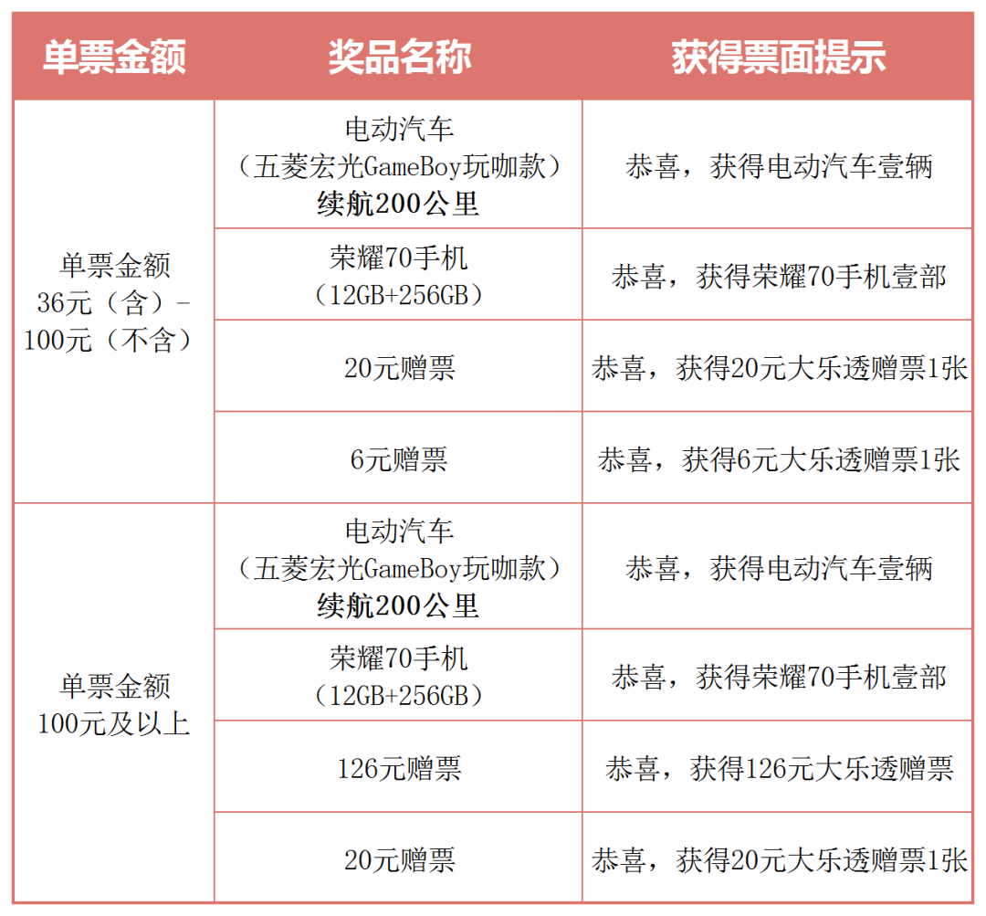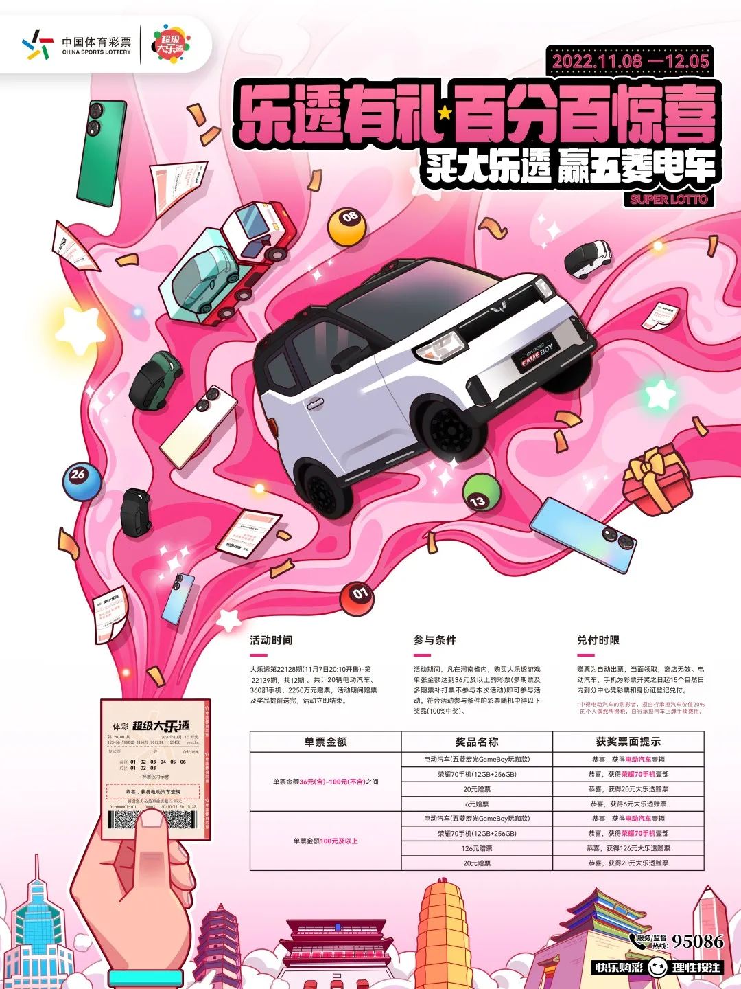 活动期间,凡在河南省内,购买大乐透游戏单张金额达到36元及以上的彩票(多期票及多期票补打票不参与本次活动,以下同)即可参与活动。有机会中得电动汽车、荣耀70手机、126元赠票、20元赠票、6元赠票等。