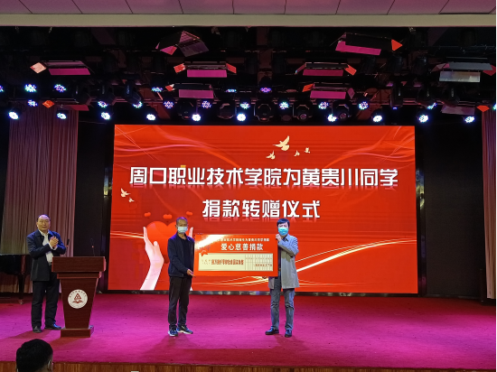 11月4日上午,周口职业技术学院举行为该校学生黄贵川捐款转赠仪式。校领导刘士欣、李庶泉、李秀萍及有关部门负责人参加仪式。