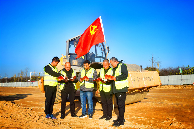 党旗迎风飘扬,机器轰鸣作响,伴随着压路机、挖土机等施工机械的作业声,周口市公路系统职工在项目施工现场学习党的二十大精神成为一道亮丽的风景。