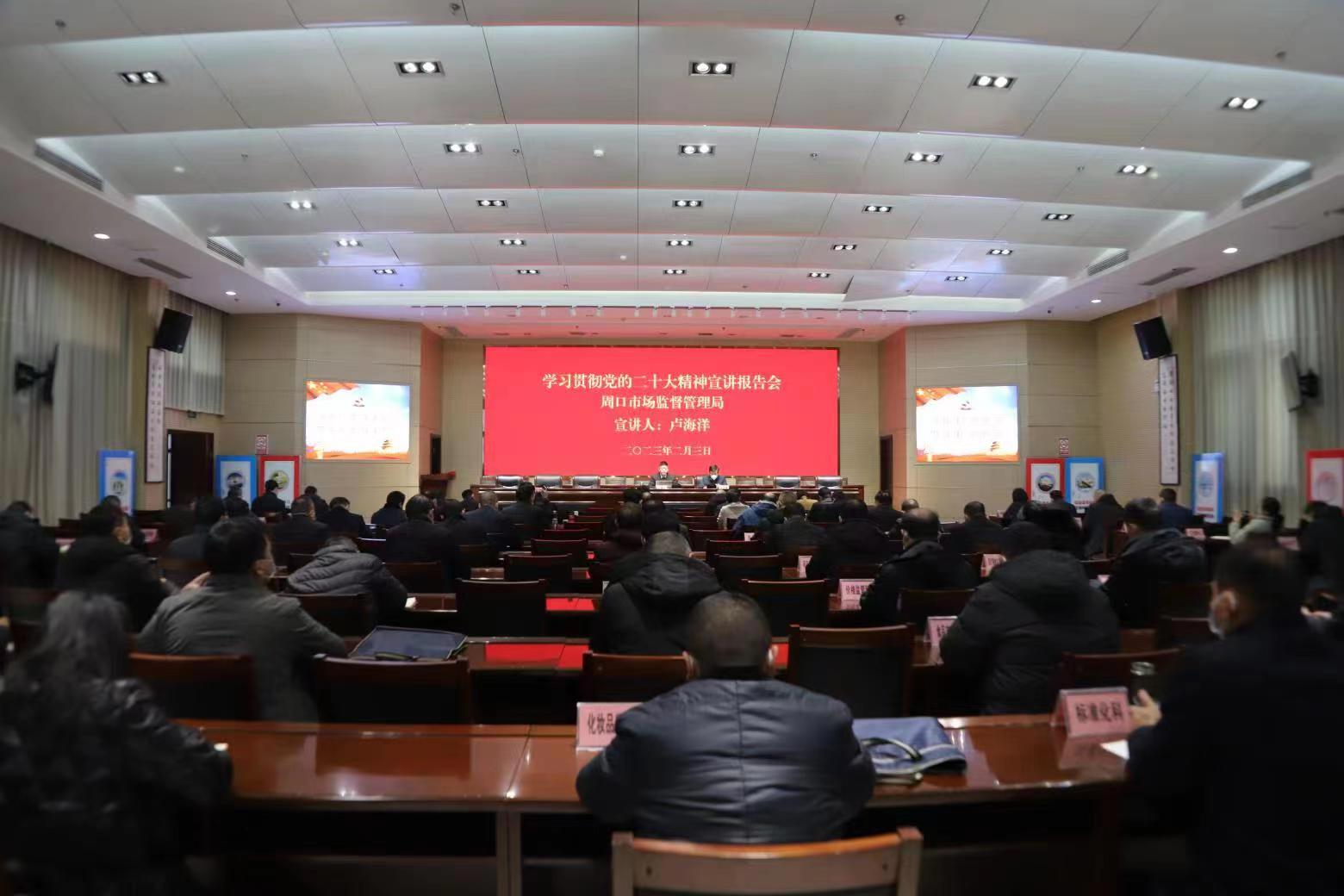 为深入学习贯彻党的二十大精神,推动党的二十大精神在全系统落地生根,2月3日下午,周口场监管局召开专题会议,宣讲党的二十大精神。市局党组书记卢海洋作专题报告,市局处级干部、机关各科室和二级机构负责人参加报告会。