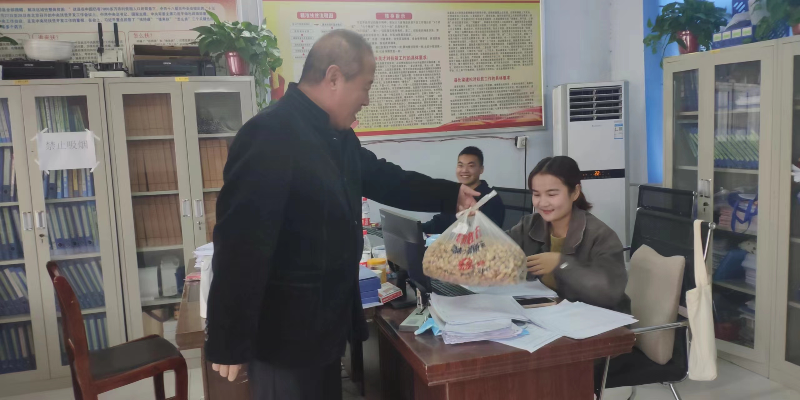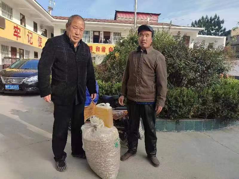 “崔书记,今年俺种的花生收获了,今天给你送一些尝尝。”近日,鹿邑县辛集镇朱楼行政村村民王义肩扛一尼龙袋花生,手提一桶花生油赶到镇政府,交到扶贫干部崔金城手里。