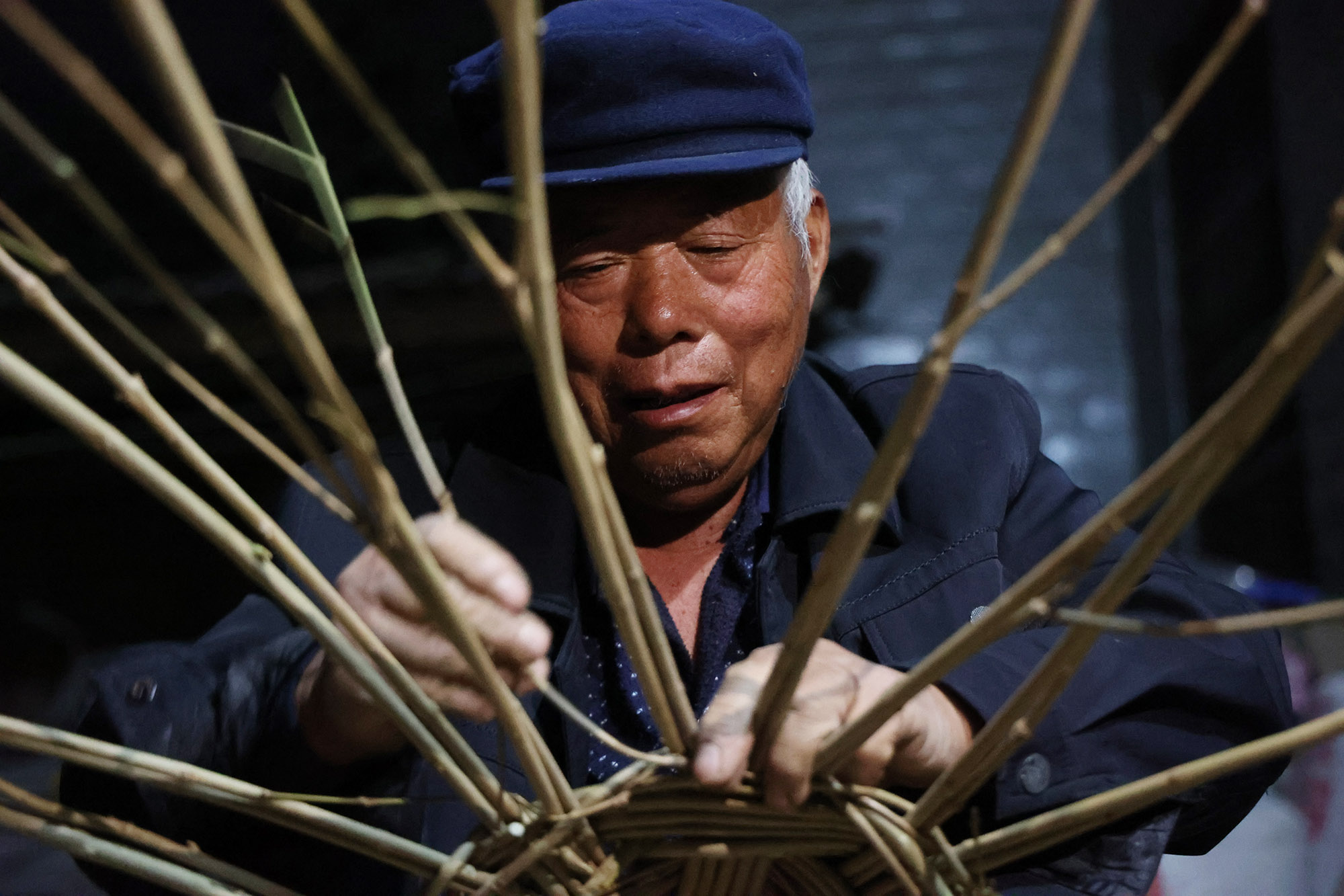 清夜无尘,月色如银。10月19日,李大庄乡黄楼村村民王东昌晚饭后在自家庭院里开始编筐。地面上放着几捆粗细不一的白蜡条,这是他白天从河坡地里砍来的。裙条盘底、细条封底、手编脚踩、泾渭分明……白蜡条在王东昌手里灵活盘绕。他今年74岁,小时候就跟家里人学会条编,这辈子编了多少筐篓,他记都记不清了。
