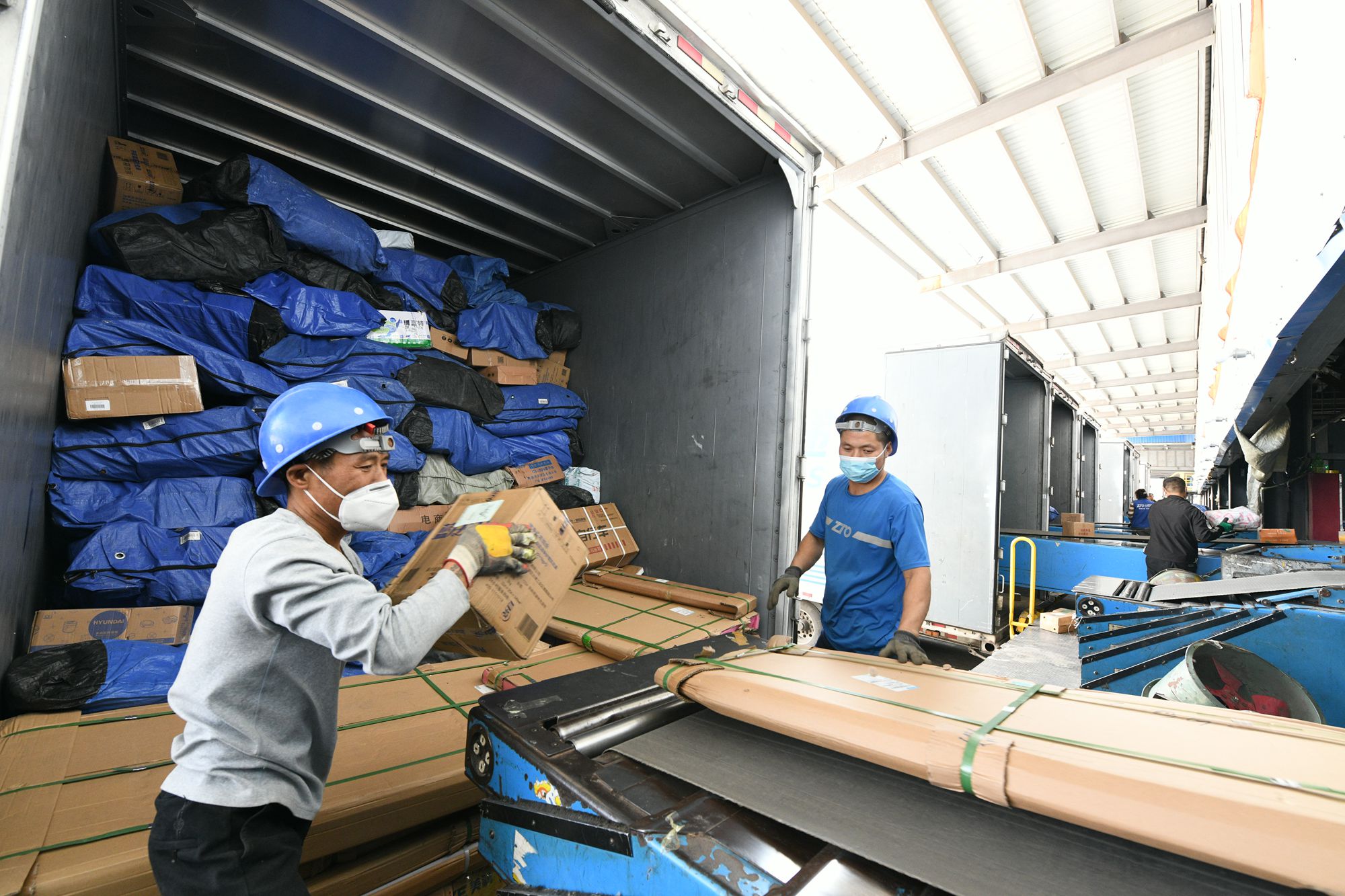 中通快递豫南分拨中心的员工紧张分拣寄件
