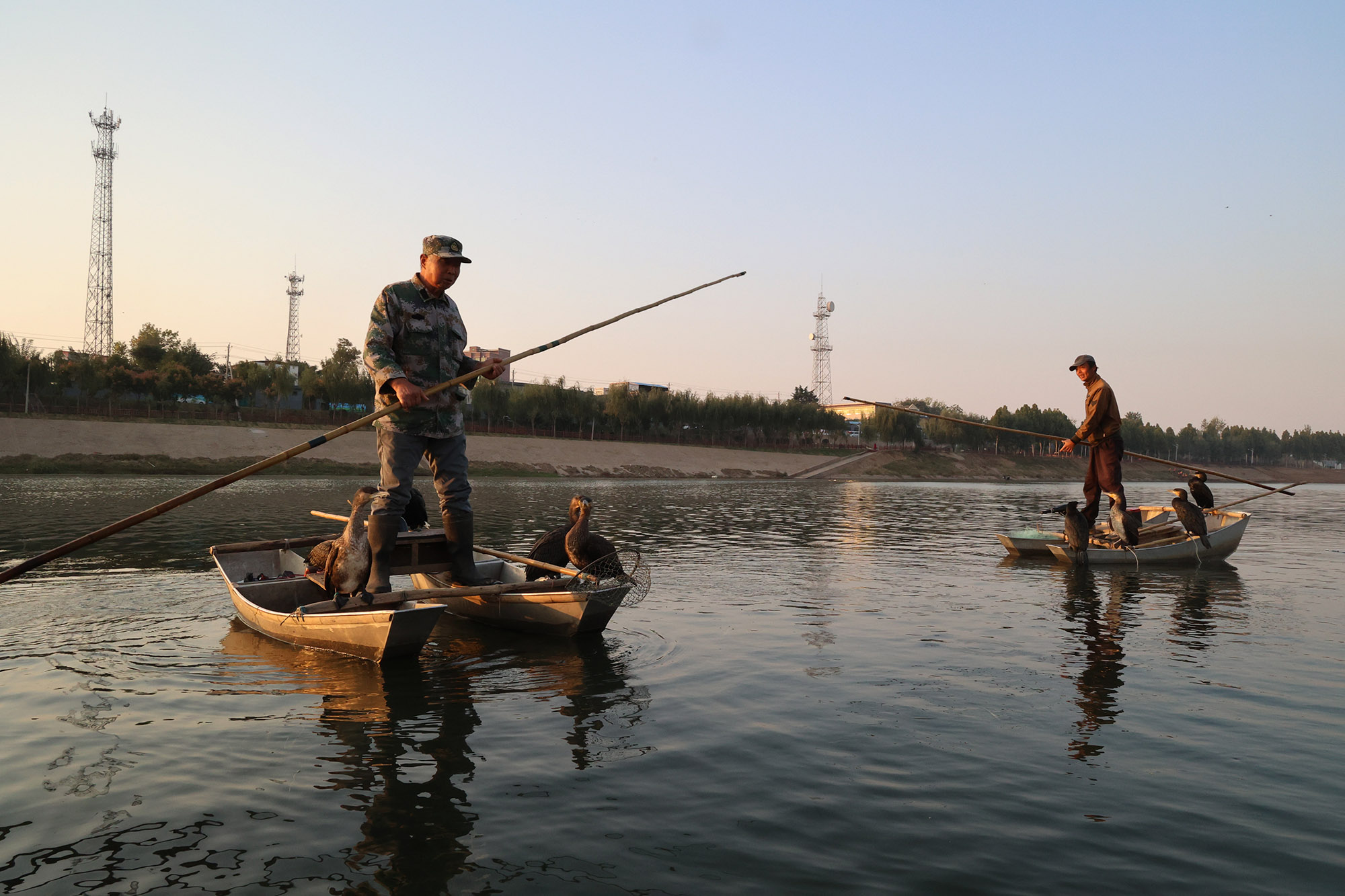 傍晚的逍遥镇沙河里,渔民划着渔船载着鱼鹰捕鱼