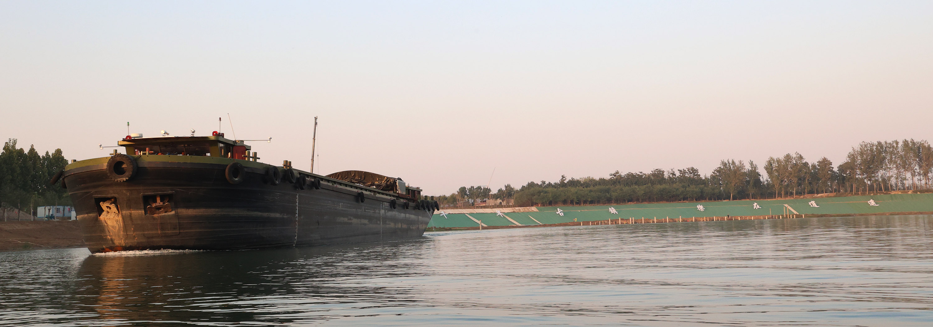 一艘货轮行走在逍遥古镇边