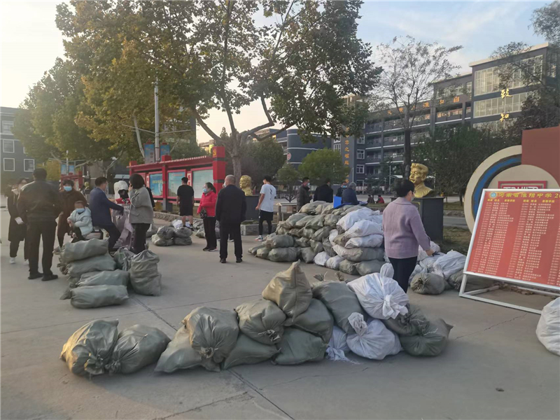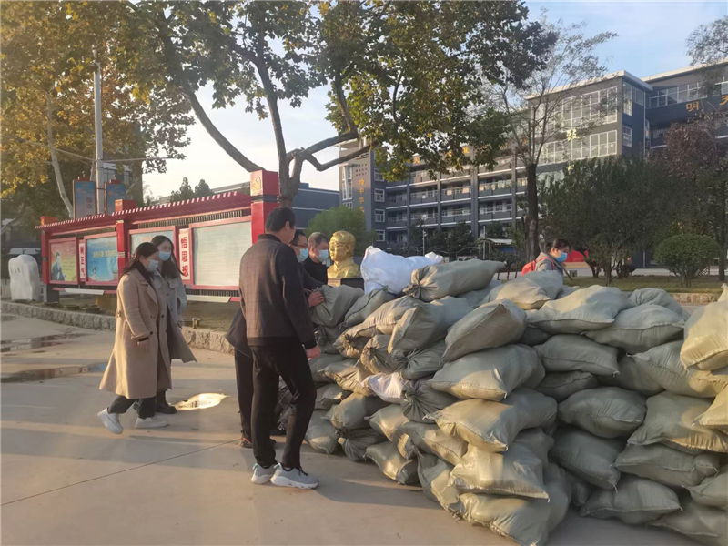 11月14日下午,在淮阳中学青春广场上,成袋的萝卜堆积在一起,这是学校从该区王店街道办事处高庄村认购的“爱心”萝卜。