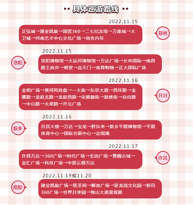 巡游活动将会陆续在开封、洛阳、新乡、许昌、南阳五市展开,途经各个地市商圈及市中心地带,马上参考我们下方的路线,追着我们的车队一起跑起来吧!