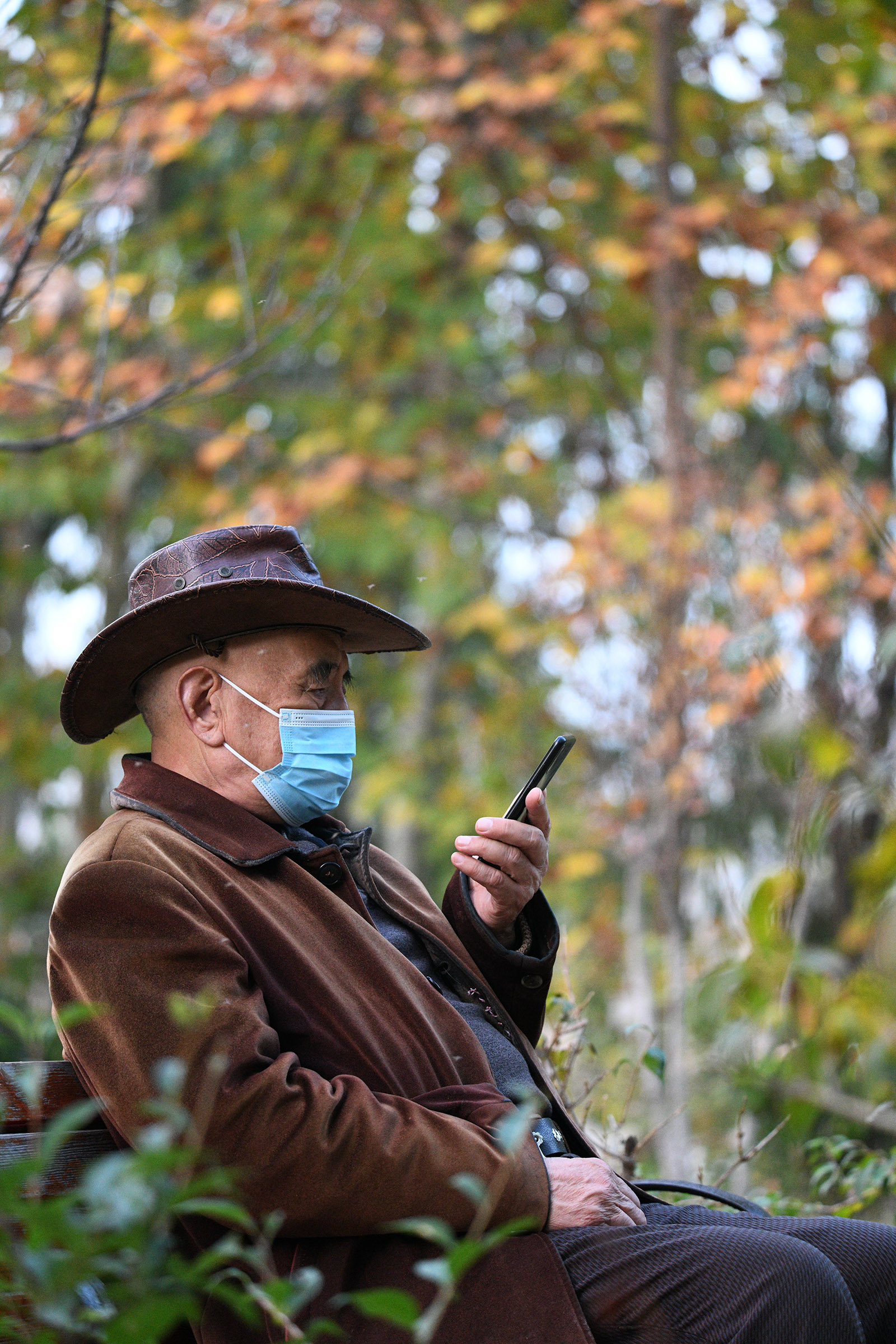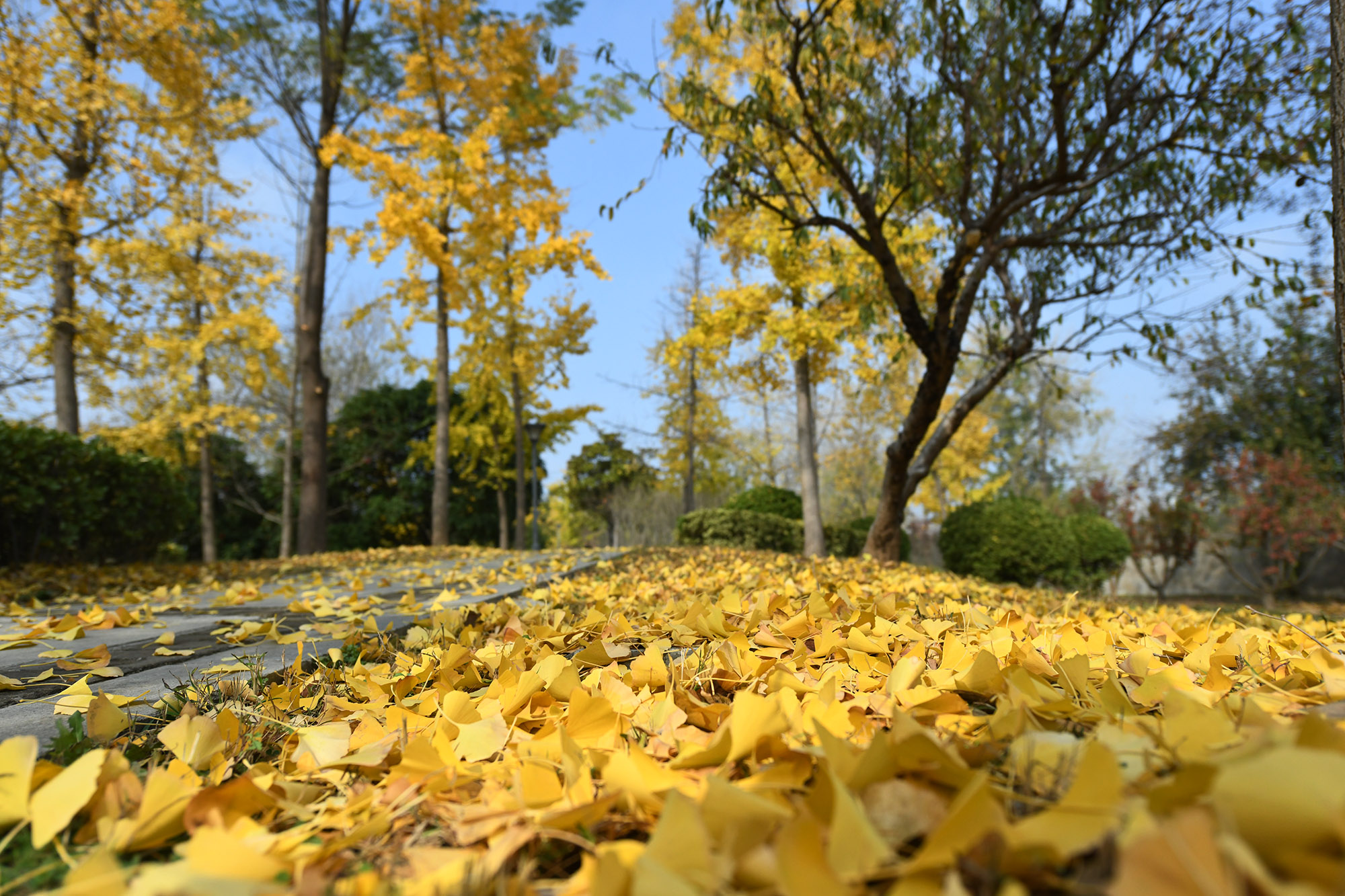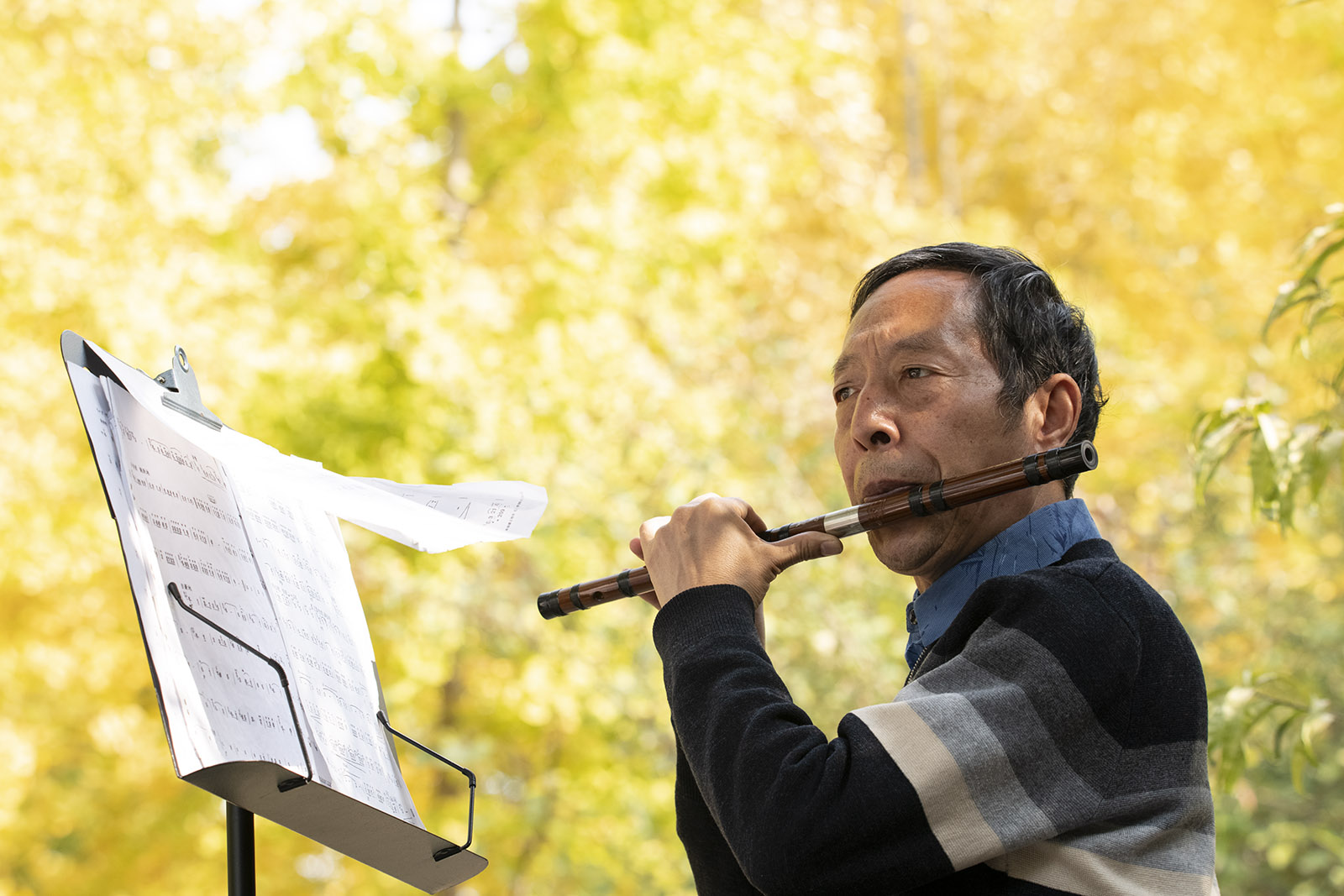 一位音乐爱好者在开发区广场银杏林享受天籁之音