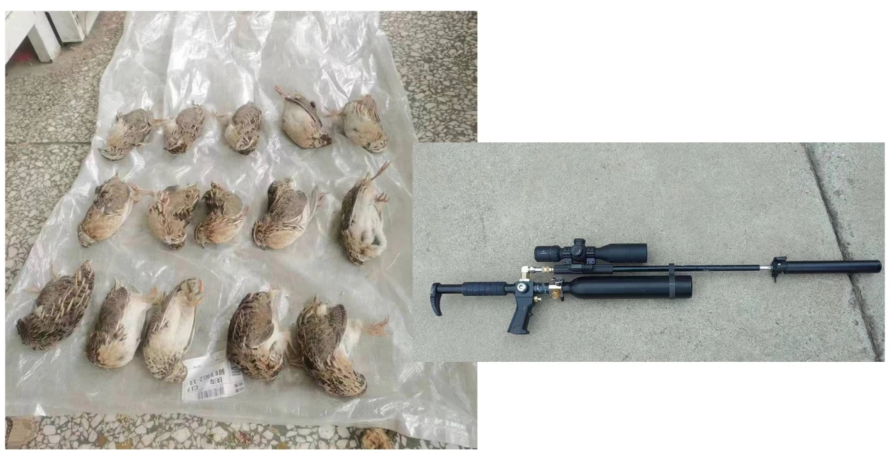 11月17日晚,扶沟县公安局森警大队联合四站派出所在四站农场一带巡逻时,发现2名涉嫌非法狩猎野生鹌鹑的可疑人员。民警悄悄跟进,瞅准时机后果断出击,现场将犯罪嫌疑人张某、张某志父子二人抓获,并当场查获野生鹌鹑死体41只、捕鸟网四张;在其居所搜出“快排”气枪一把。经连夜审讯,张某父子二人供述自2020年以来,在禁猎区、禁猎期分别采用“土网”“快排”气枪等作案工具,在扶沟县四站、汴岗等地多次非法狩猎野生鹌鹑1000余只。