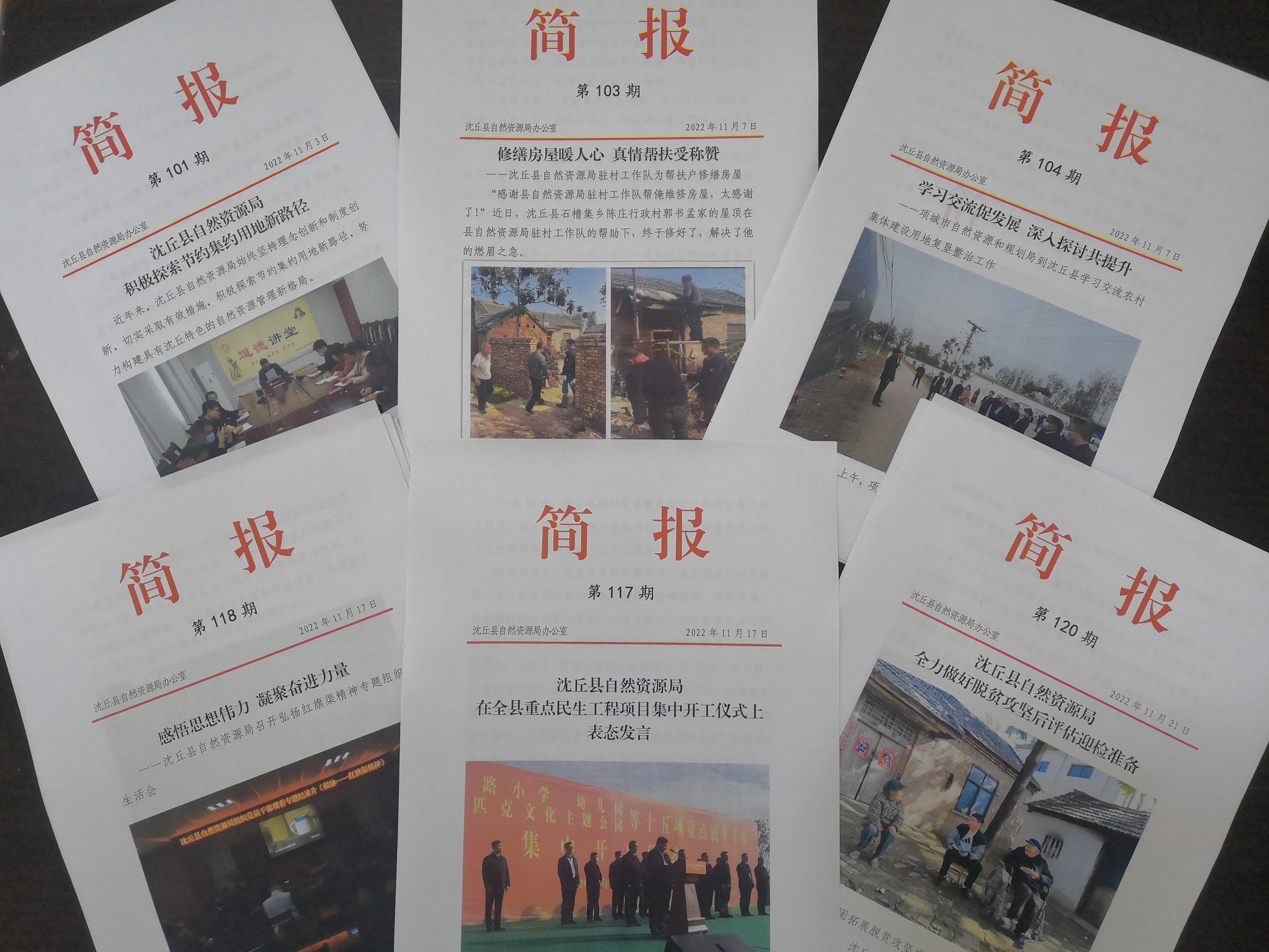 据了解,为让信息宣传工作贯穿于自然资源工作中,沈丘县自然资源局办公室安排专人负责编发工作简报,多方位、多视角地展现全县自然资源系统的重要部署、宣传教育、队伍建设、机制创新、党建动态、不动产登记、驻村帮扶等经验做法、先进典型以及工作开展情况。简报题材新颖、与时俱进、图文并茂,成为向外界展示工作动态的窗口、经验交流的平台,对交流典型经验、反映重点难点问题、开拓工作思路、弘扬时代主旋律、传播正能量、积极推进工作开展发挥着重要的作用。今年以来,共编发简报125期。