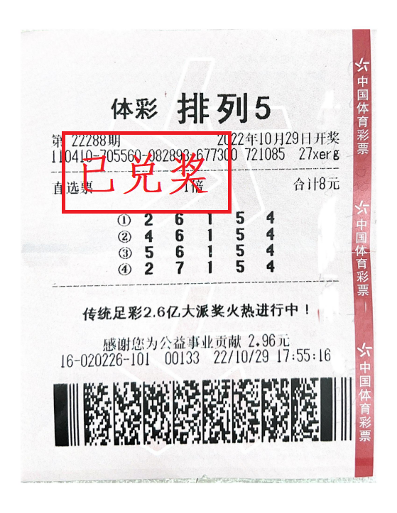 河南省体育彩票管理中心周口分中心兑奖大厅11月1日迎来了幸运购彩者王先生(化名)。10月29日,排列5第22288期开出号码“5、6、1、5、4”,周口市区购彩者收获“排列5”直选1注,揽获奖金10万元。