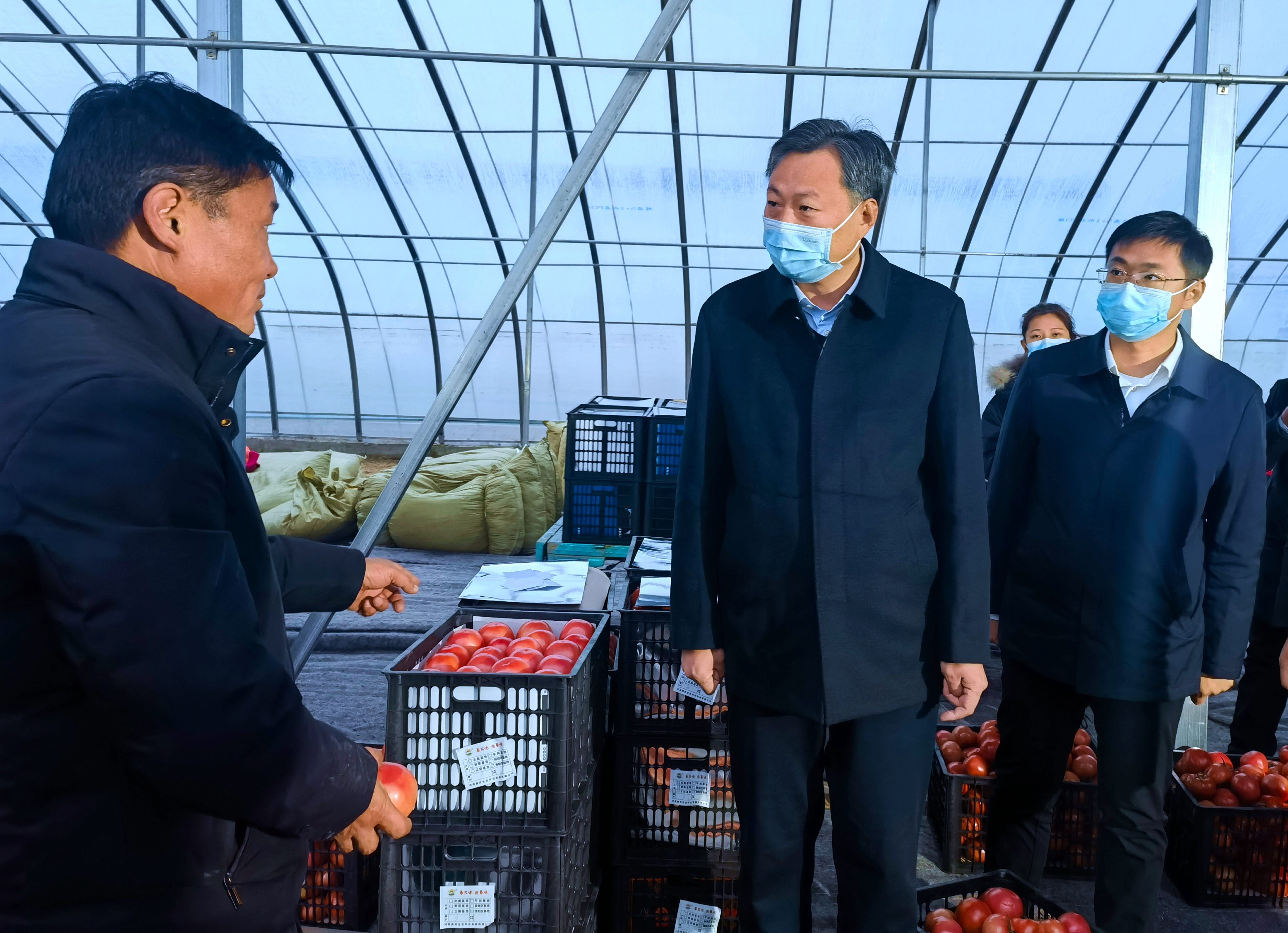 图为11月30日,工作人员在西红柿产业园与菜农交流,详细了解蔬菜滞销原因。