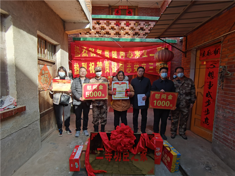 慰问组一行先后来到付井镇贾健、纸店镇赵稳超家中,与军人家属亲切交谈,详细了解他们的家庭生产生活情况,送上立功喜报和慰问金,感谢他们为国家、为部队送去优秀人才,为沈丘赢得荣誉。军人家属倍感温暖和光荣,表示要让孩子扎根军营、牢记使命、再立新功。