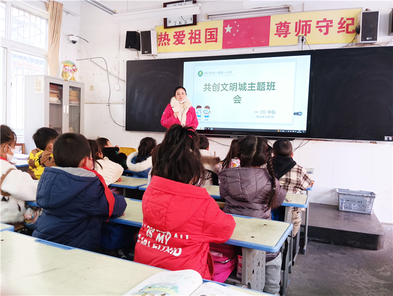 周口市七一路第一小学12月2日组织各班级开展“共创文明城市”主题班会活动。各班班主任向同学们宣传创建文明城市的意义,对同学们进行文明礼貌守则、社会主义核心价值观、行为习惯、公民道德规范等教育,号召同学们小手拉大手,和家长们一起参与活动,实现“教育一个学生、带动一个家庭、文明整个社会”的目标。