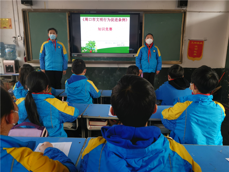 周口市六一路小学11月29日启动《周口市文明行为促进条例》学习宣传系列活动。班主任、老师带领学生深入学习领会《周口市文明行为促进条例》的重要意义,并组织学生学习总则、规范与倡导、保障与促进、法律责任、附则等五个部分的内容。同学们边学习,边交流分享自己的切身体会和收获。