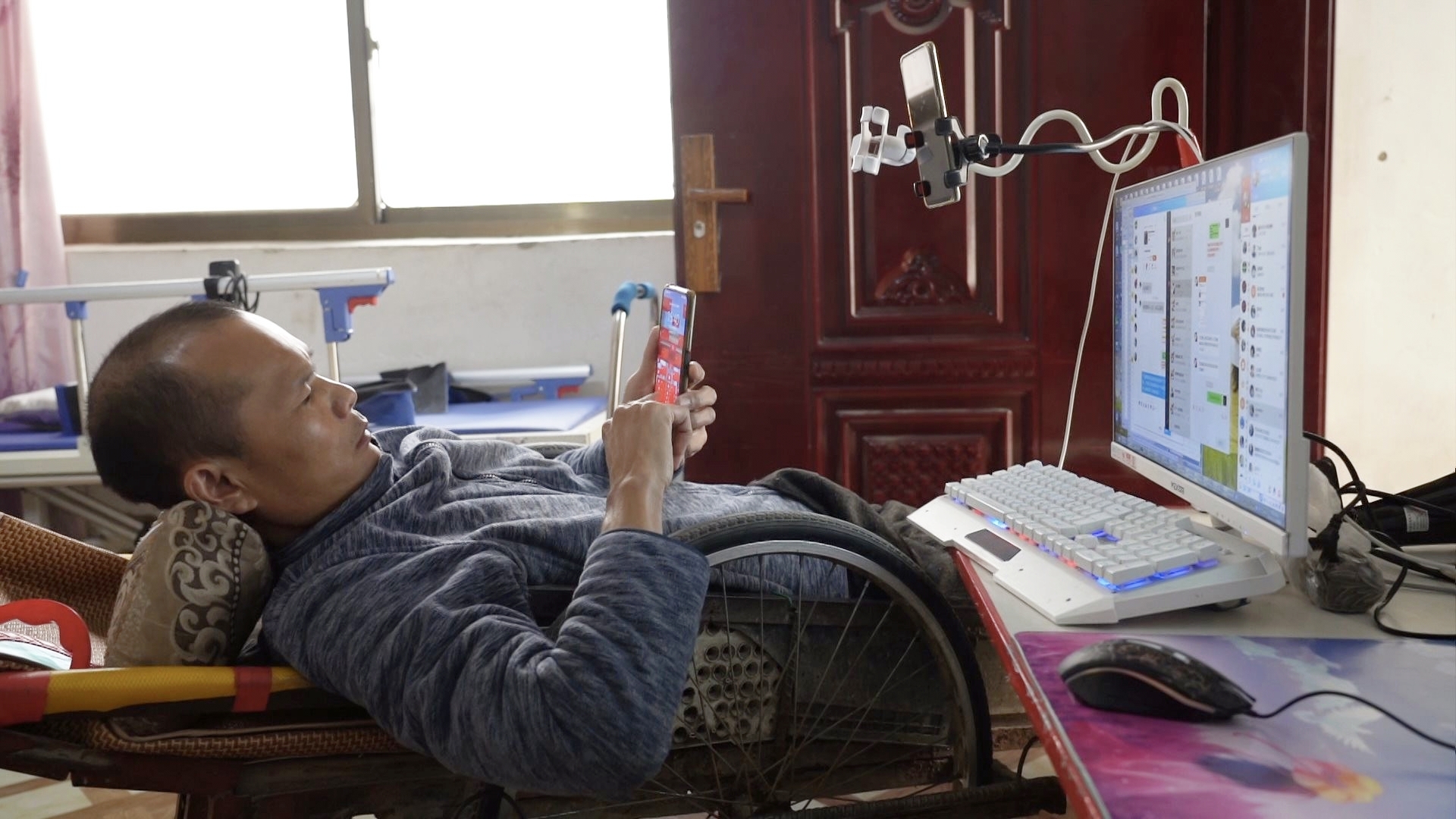 果不其然,戚志强扫了一眼手机,确实是一位电商“老板”在派发任务。他立即放下手机,抬起双手,转动着身体两侧的轮子,随着轮椅板车来到屋内的电脑桌旁。