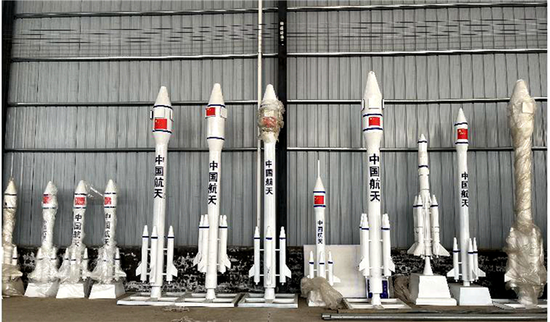 2017年底,厂房建成投产后,陆续生产出13米长、3.3米宽、3米高的“辽宁号航母”模型;长13米、宽2.8米、高2.6米的“东风21导弹车”模型;长11米、翼展7米(机翼展开)、高3米的“歼10和歼20战斗机”模型;长15米、宽4米、高3米、重达6吨左右的“和谐号”模型;以及各种型号的航空母舰、坦克、装甲车、航天火箭等军事装备模型。