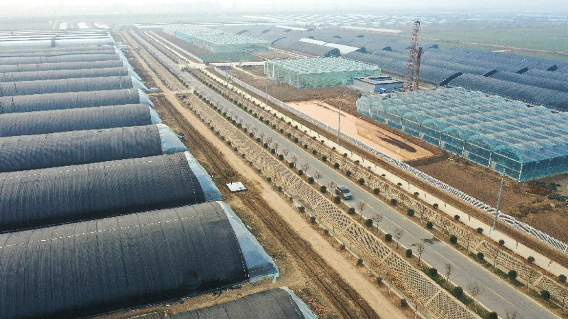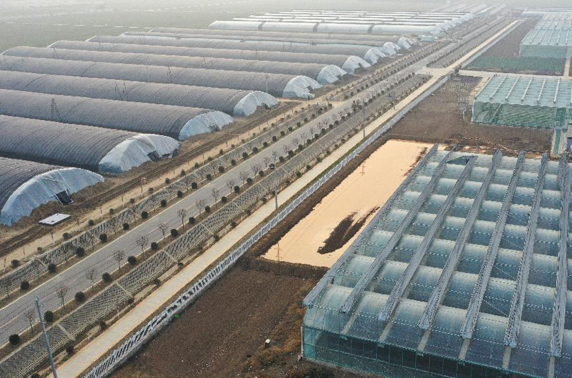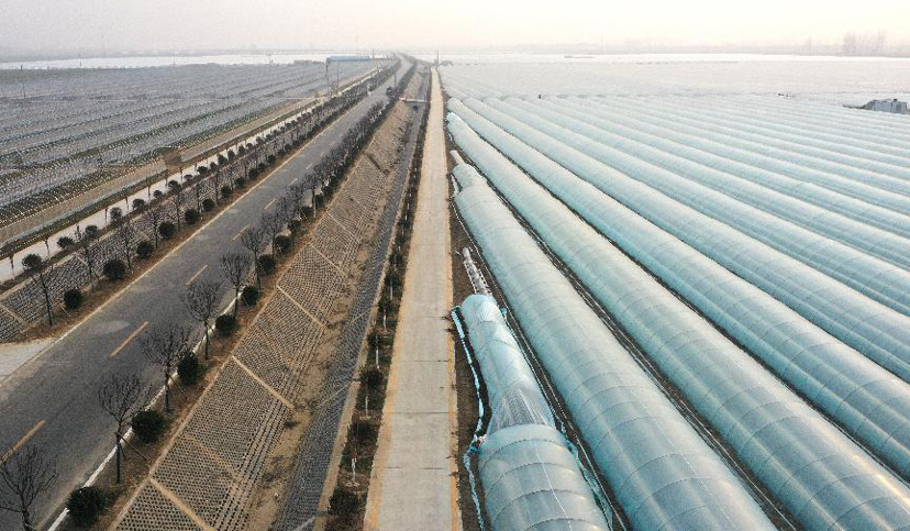 寒冬时节,航拍扶沟县蔬菜园区,蔬菜大棚一望无际,好像白云朵朵落田间,一条条护砌沟渠与路同行,纵横连接,奔向远方,一个现代化的蔬菜园区如同一幅画卷铺在广袤的大地上。