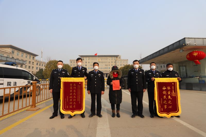 1月10日上午,太康县公安局门口,居住在太康城区的李女士赶到公安局,将两面锦旗送到民警手中,眼含热泪地说,“钱被骗了,我死的心都有,没想到公安局效率恁高,抓了14个骗子,把我的43万全部追回来了。感谢太康县公安局的警察!”该县公安局党委委员、政办室主任郑先兵带队接受群众的褒奖。