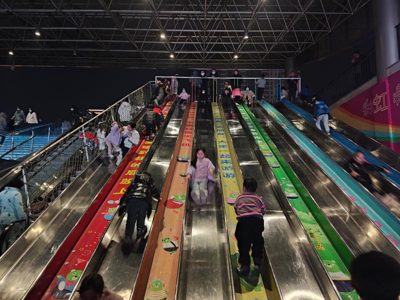 滑梯是广场上最受孩子们欢迎的娱乐设施,有的孩子站在滑梯上“呲溜”一下滑下来,十分酷炫。有的孩子在滑梯上相互追逐,愉快的笑声在空中回荡。广场上,卖玩具的摊点星罗棋布,各种颜色的发光气球深受孩子们的喜爱。