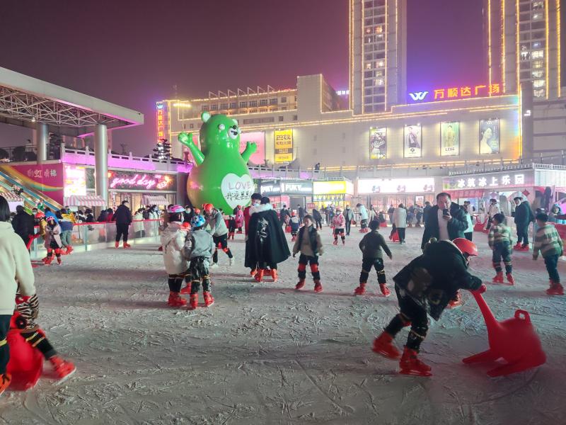 广场中央有一处冰上乐园,人们随着动感的音乐飞快地滑行。有的像敏捷的燕子来回穿梭,有的像企鹅一样摇摇摆摆挪动着步子。冰上乐园的老板告诉记者,这半个多月生意特别好,预计春节期间人会更多,计划一直营业到春节以后。