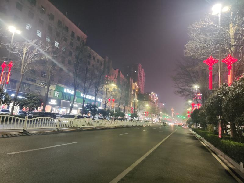 漫步七一路,一个个鲜红的中国节挂满灯杆,在灯光的照耀下光彩夺目。五一路两旁的商场灯光五颜六色,鲜红的灯笼瞬间让整条大道有了节日的氛围。