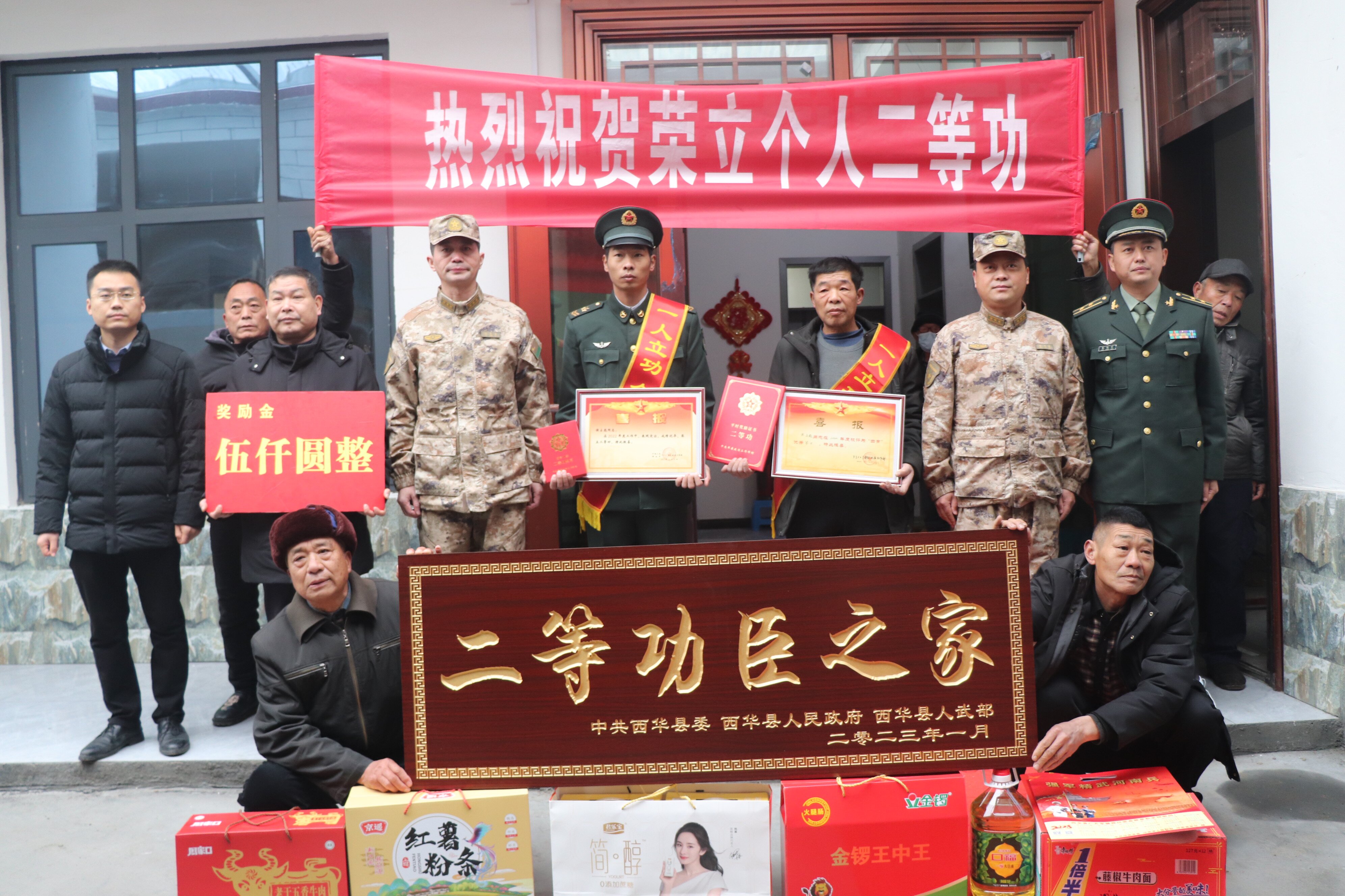 新春佳节喜讯传,锣鼓欢庆来报喜。1月13日上午,西华县逍遥镇白十村军属侯学点门前人头攒动,锣鼓震天,一派喜气景象。县人武部上校部长张大钊、上校政委闫忠玉,县退役军人事务局党组书记龚坤敬、局长张翼飞,73123部队政治部副主任周邵雪,联合登门送来二等功喜报、奖匾和5000元奖金。