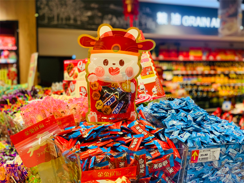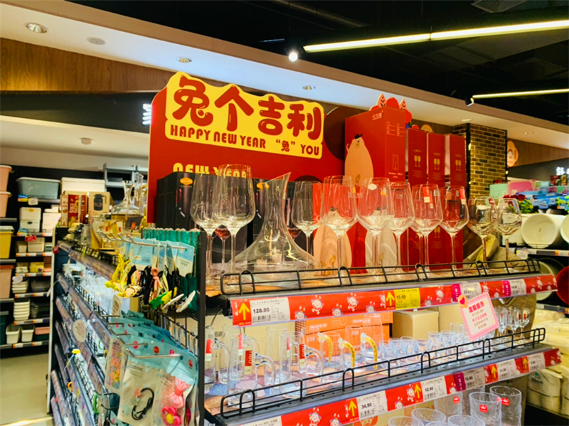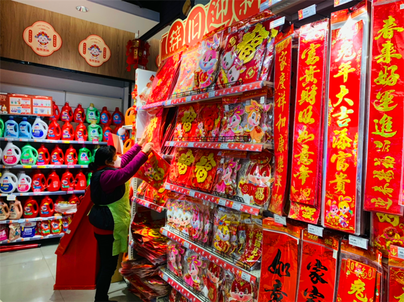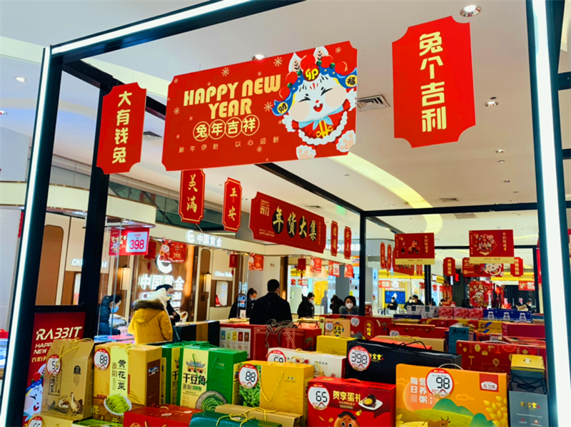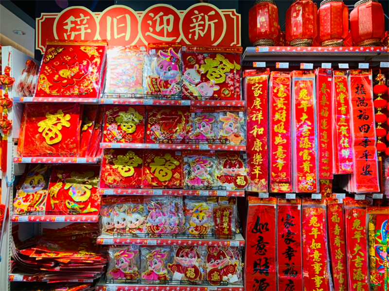 中心城区一些商场、超市早已开启了“兔年模式”,“大有‘钱’兔”“‘兔’个吉利”“钱‘兔’似锦”的喜庆标语特别醒目。在一峰城市广场入口,货架上挂满了兔子造型的春联,全是以“兔”为主题的。不少坚果、曲奇、糖果等零食礼盒上都印上了萌兔图案,生活用品区内还摆有兔子拖鞋、兔子牙刷、小兔毛巾等。