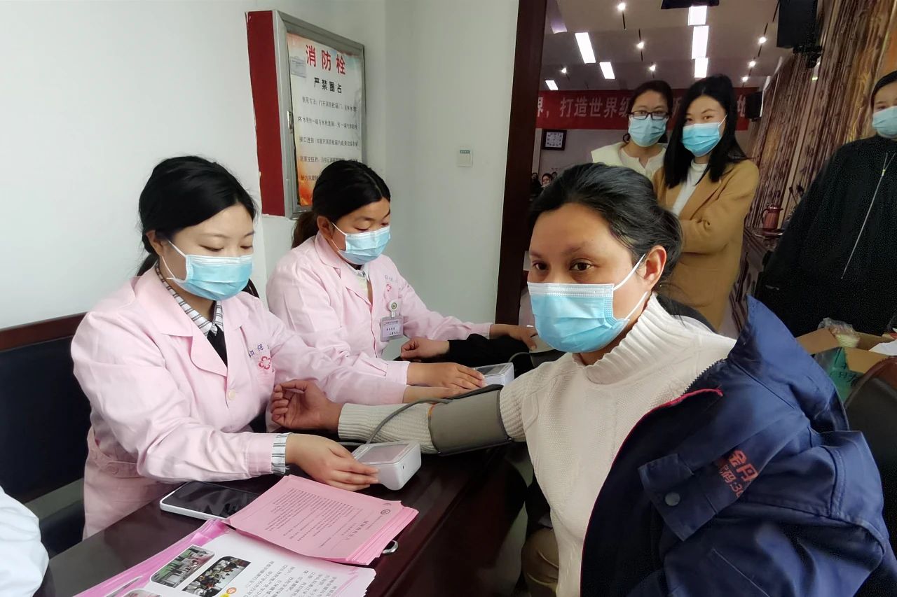 医护人员为有需要的女职工听诊、检查乳腺、测量血压、血糖,针对常见病、多发病的预防和自查解疑答惑,提供科学的指导性意见。