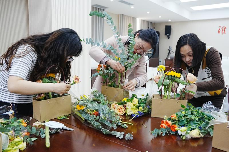 活动现场,花艺师为大家详细讲解了插花种类、色彩搭配、造型要素等插花技巧,认真演示并悉心指导大家亲手操作。女同志们有的用手剪枝、有的精心挑选、有的左右调整,将一枝枝花草完美搭配,清淡醉人的花香在六楼会议室弥漫开来,一篮篮姹紫嫣红、各具特色的精美作品慢慢呈现在了大家面前。