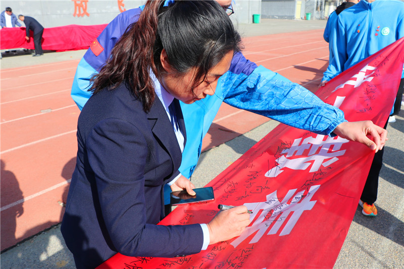 宣誓结束后,在校长季芳带领下,师生们在誓词条幅上签下自己的名字,向学校、老师、家长,作出自己的保证。