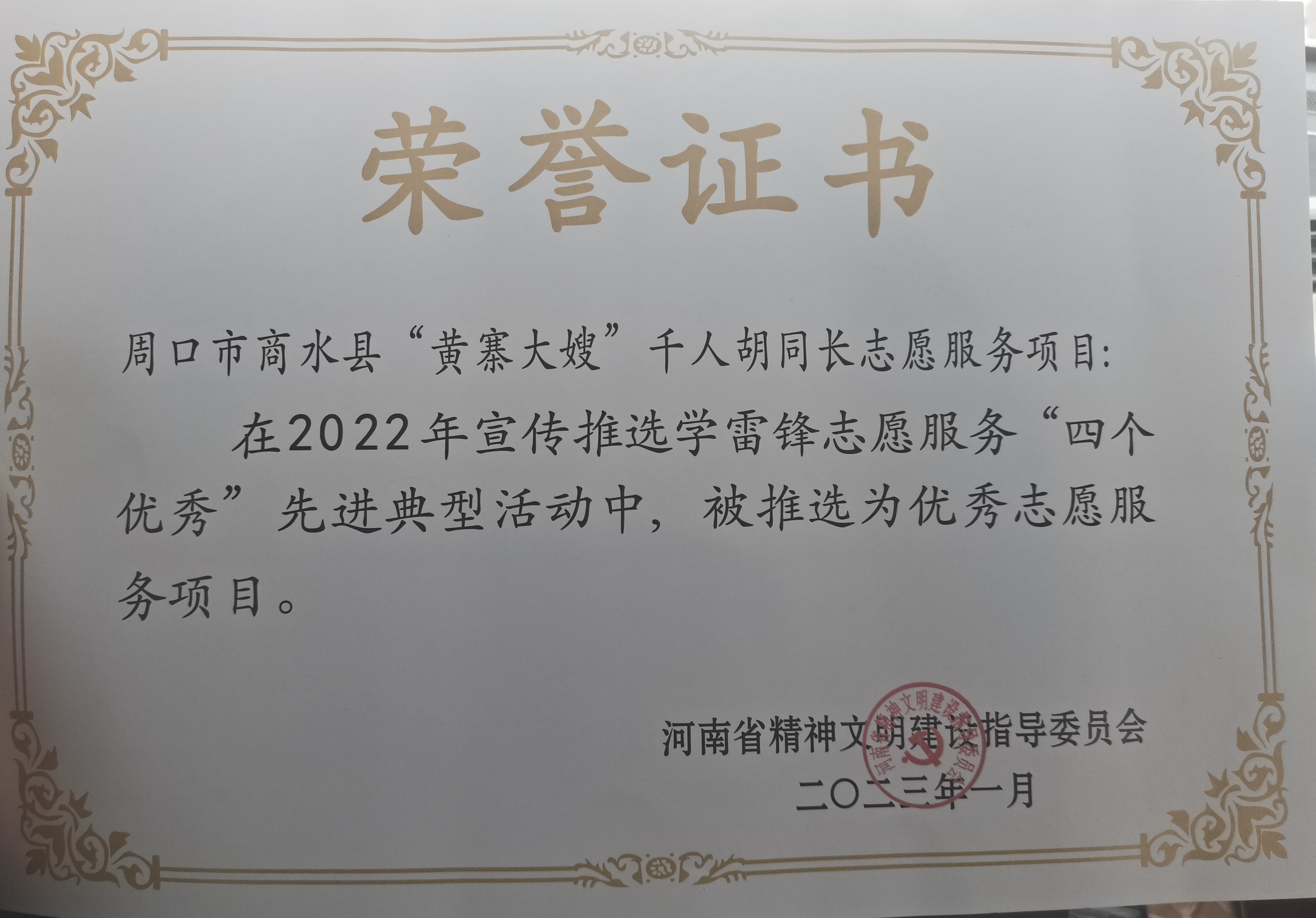 据介绍,人民日报客户端、新华网客户端、河南日报、河南日报(农村版)、周口日报等媒体,多角度、全方位对商水县“黄寨大嫂”千人胡同长分别进行了报道,社会反响强烈,商水县“黄寨大嫂”千人胡同长志愿服务队获得荣誉不断。2022年6月,商水县“黄寨大嫂”千人胡同长志愿服务队在河南省疫情防控优秀志愿服务先进典型宣传推选活动中,被河南省精神文明建设指导委员会推选为优秀志愿服务组织。2023年1月,周口市商水县“黄寨大嫂”千人胡同长志愿服务项目在2022年宣传推选学雷锋志愿服务“四个优秀”先进典型中,被河南省精神文明建设指导委员会推选为优秀志愿服务项目。
