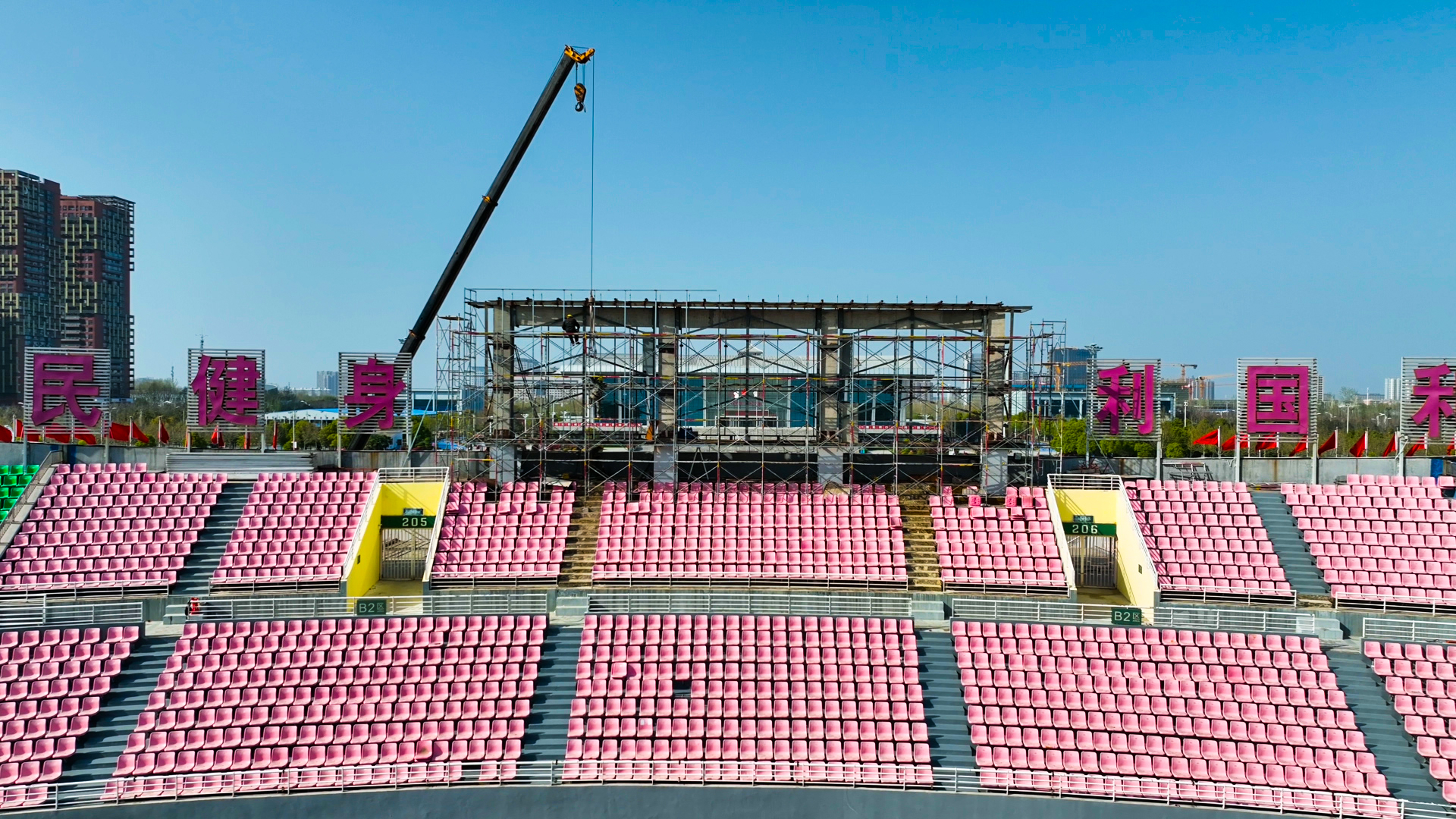 3月27日,在周口市体育中心,工人正在指挥吊机安装更换体育场内的LED屏幕,安装完成后将用于现场直播第九届全省民族运动会表演项目。记者 戚勇 摄