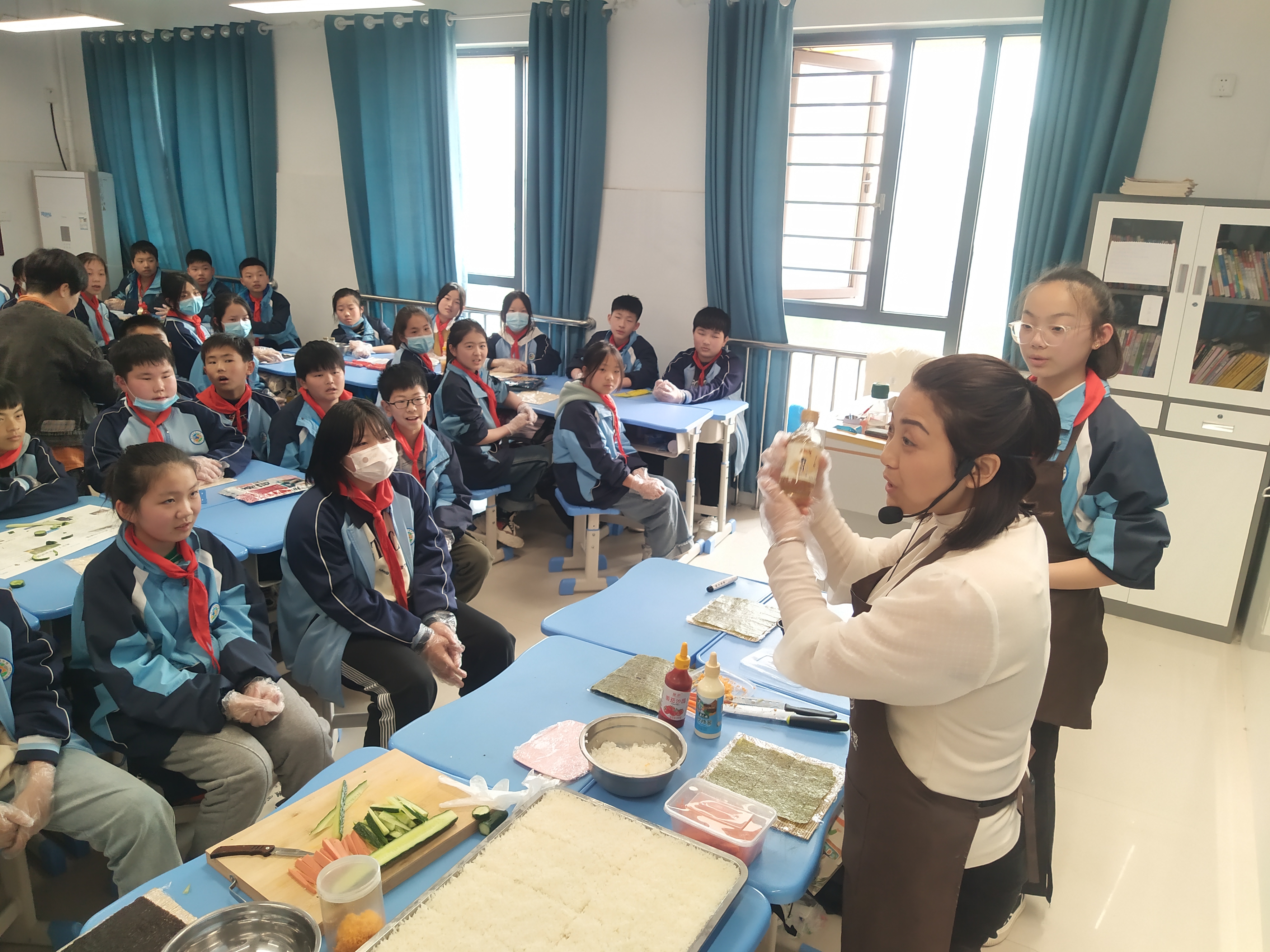 记者看到,课桌上摆满了各种所需食材:番茄调味酱、沙拉酱、黄瓜、火腿肠……开始动手了,同学们团结协作,合理分工,节约材料,配菜切条、放上海苔、铺满米饭和配菜、边卷边压,切菜装盘……一时间,手上、脸蛋上粘着米饭,心中却洋溢着快乐的幸福。做成后,同学们互相分享着,有的同学还把劳动成果送给老师、校长一起品尝,倾听意见。
