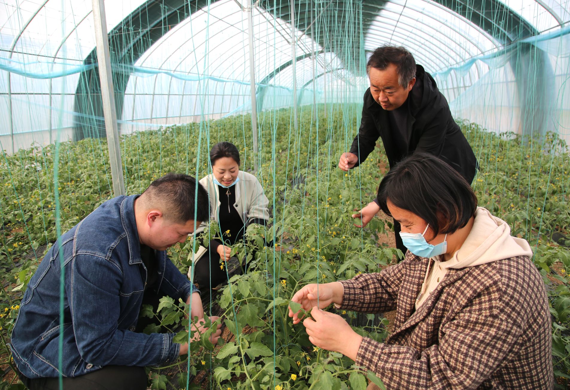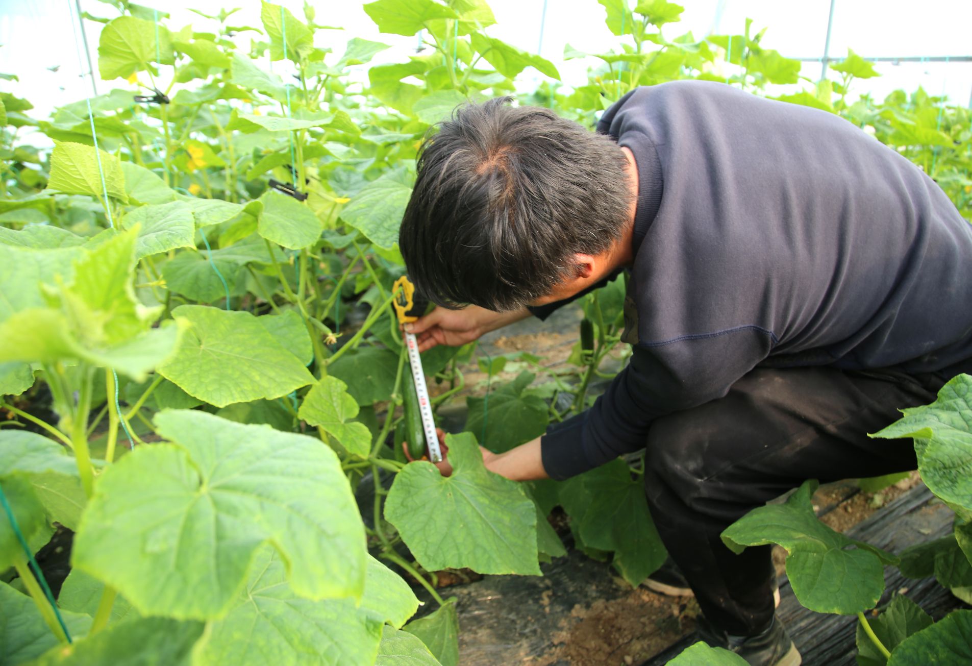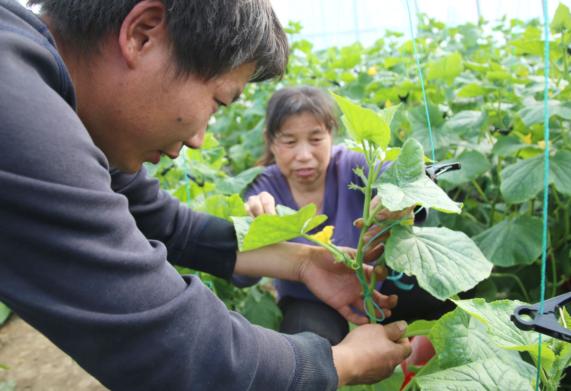 4月1日上午,鹿邑县王皮溜镇村民王新建种植的有机小黄瓜达到采摘长度,与商丘蔬菜批发商签订3万斤首茬订单,每斤3.25元,预计纯收入6万元,图为村民们在技术员指导下加强黄瓜管理。①2