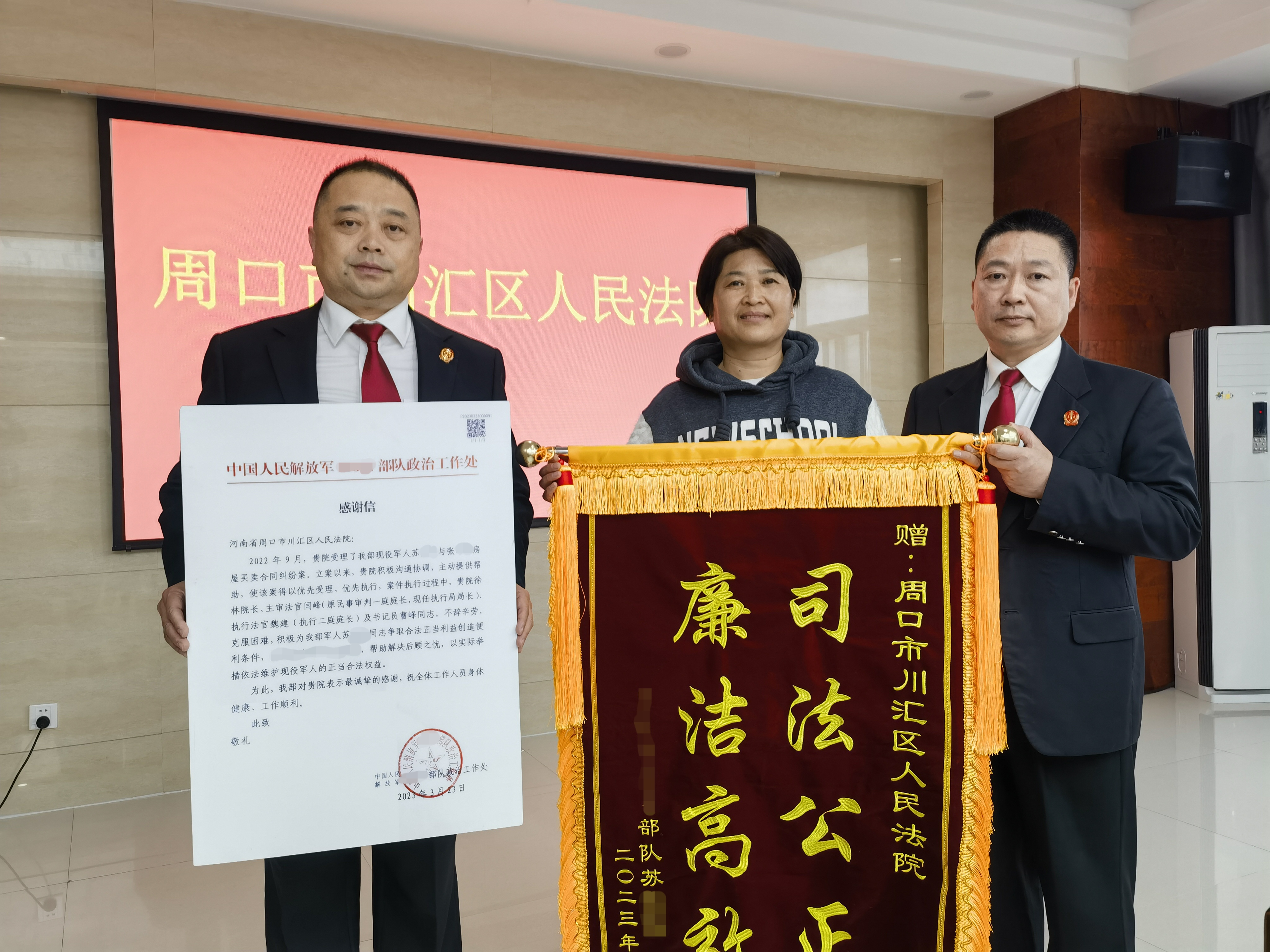 4月3日上午,苏某某委托自己的母亲石俊娥为川汇区人民法院送来一面司法公正廉洁高效的锦旗。石俊娥感激地说:“我代表女儿衷心感谢川汇区人民法院公正高效的处置,解决了军人的后顾之忧,让部队官兵能够安心服役,尽心尽力搞好国防建设工作。”