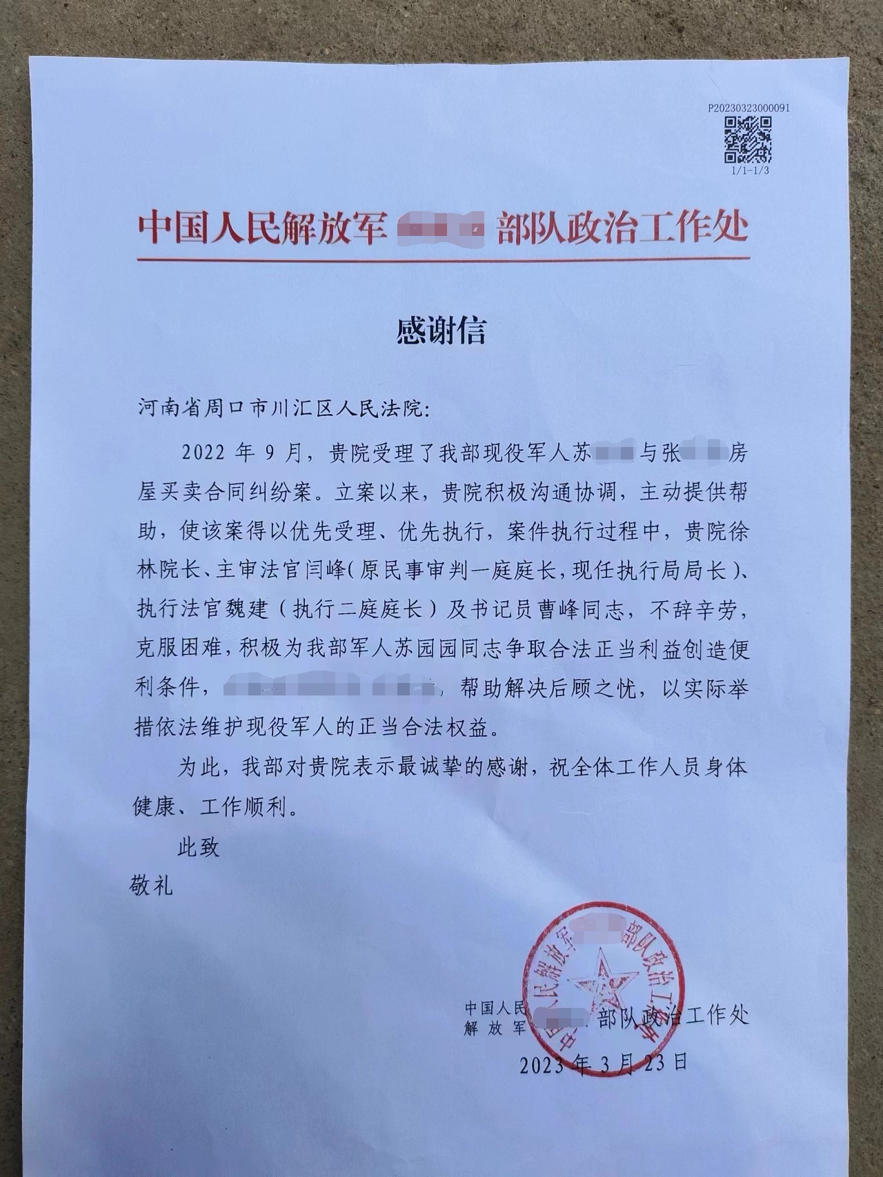 近日,川汇区人民法院收到一封来自中国人民解放军某部队的感谢信,信中对川汇区人民法院法官闫峰、执行法官魏建及书记员曹俊峰积极为现役军人争取合法正当利益,以实际举措依法维护现役军人的权益表示感谢,这是川汇区人民法院妥善快速审结涉军案件的一个缩影。