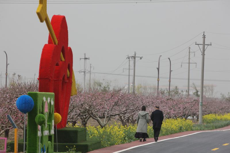 阳光正好,清风怡人,一路行来,堤左红花绿树,碧水连天,堤右风吹麦浪,青绿无边,目之所遇皆为风景。25公里路程,一个多小时很快过去,一片茂盛的桃林现于眼前,花枝轻摇,笑迎八方游客;村道整洁,房舍俨然,古朴雅致,这里就是裴庄村了。当天上万名游客赶到这里,桃花盛开灿若烟霞,空气中浮动着馥郁花香,到处都是欢声笑语,好一幅盛世桃园图!