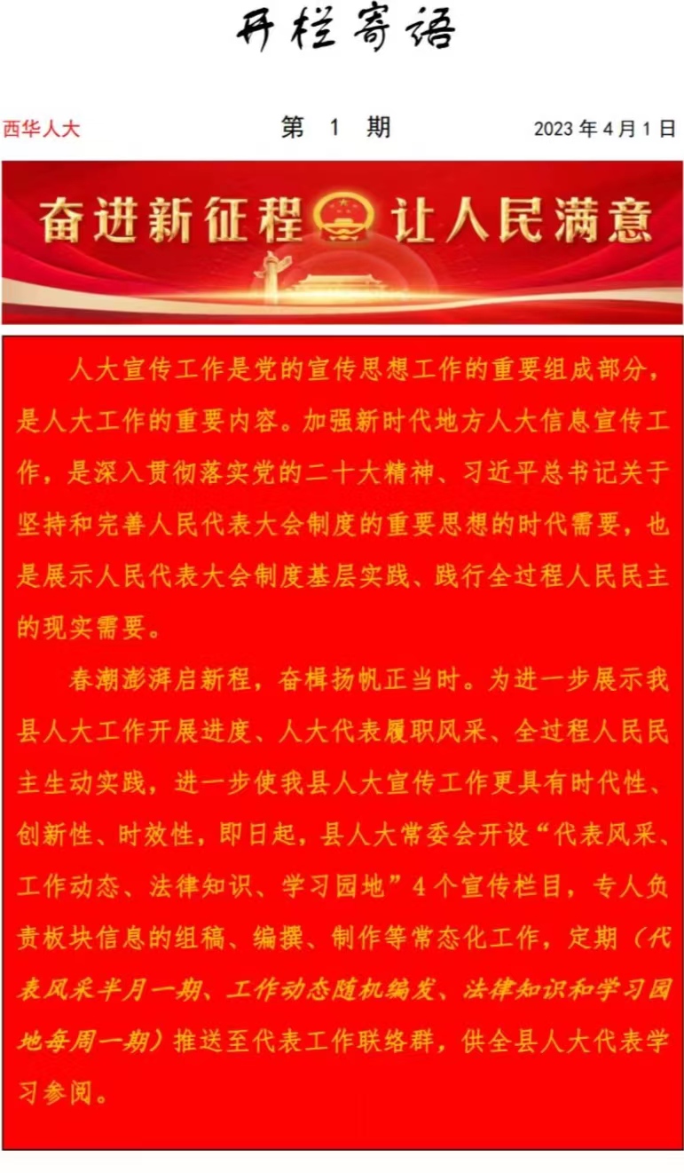 为进一步展示西华县人大代表履职风采、全过程人民民主生动实践,进一步使人大宣传工作更具有时代性、创新性、时效性,4月1日起,西华县人大常委会印发《关于加强人大新闻宣传工作的实施方案》,开设“代表风采、工作动态、法律知识、学习园地”4个宣传栏目,专人负责板块信息的组稿、编撰、制作等常态化工作,定期推送至代表工作联络群等平台,供全县人大代表学习参阅。