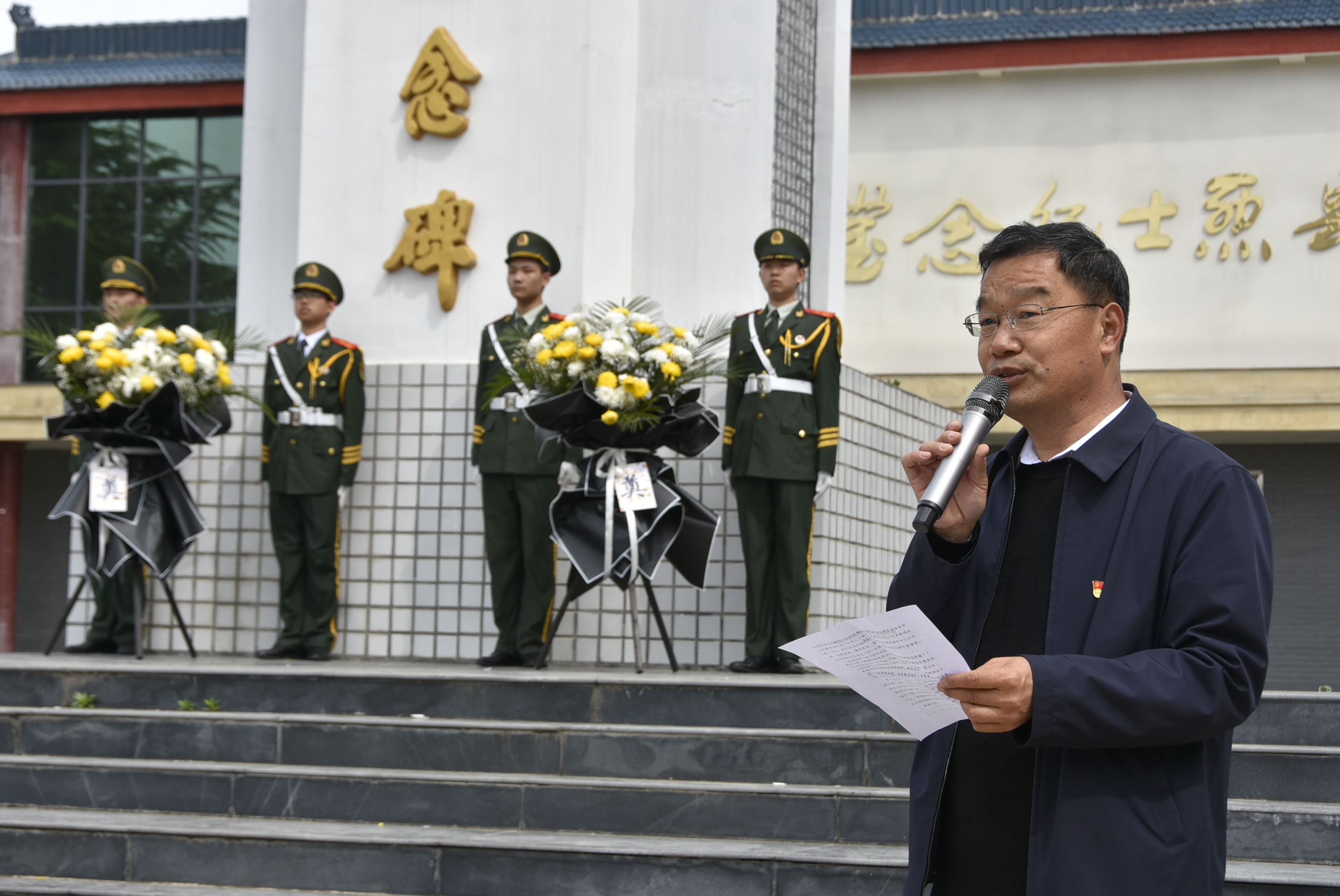 在烈士墓碑前,参与师生全体肃立,奏唱国歌后,校党总支书记白子兴、副校长党辉代表学校全体师生向烈士纪念碑敬献花篮,并整理缎带。全体现场参与人员向烈士纪念碑集体默哀三分钟。
