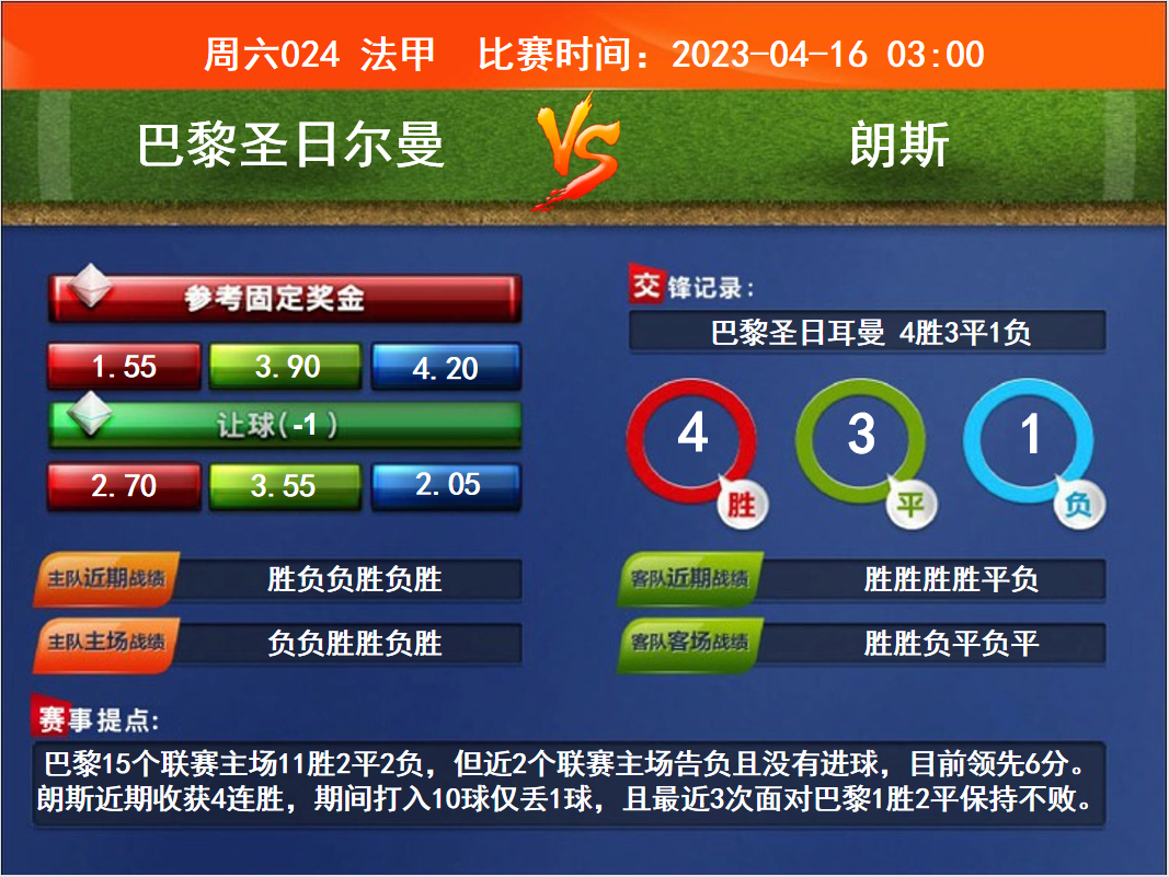 比赛时间:2023-04-16 03:00赛事提点:巴黎15个联赛主场11胜2平2负,但近2个联赛主场告负且没有进球,目前领先6分。朗斯近期收获4连胜,期间打入10球仅丢1球,且最近3次面对巴黎1胜2平保持不败。