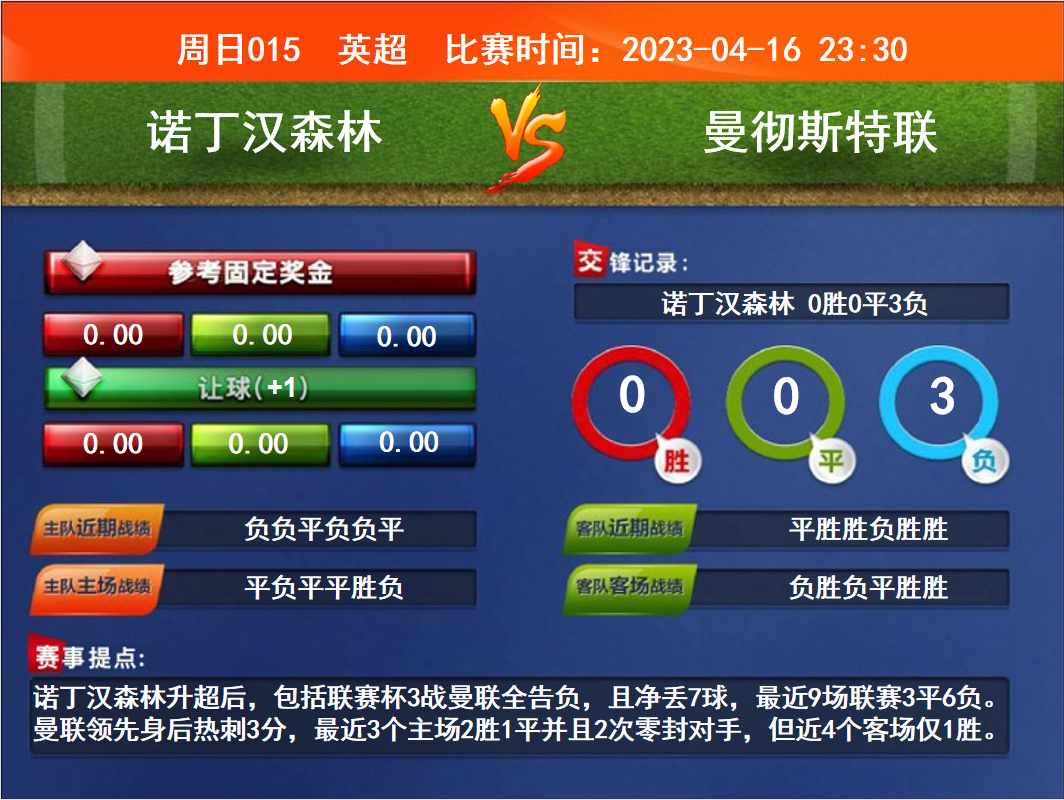 比赛时间:2023-04-16 23:30赛事提点:诺丁汉森林升超后,包括联赛杯3战曼联全告负,且净丢7球,最近9场联赛3平6负。曼联领先身后热刺3分,最近3个主场2胜1平并且2次零封对手,但近4个客场仅1胜。