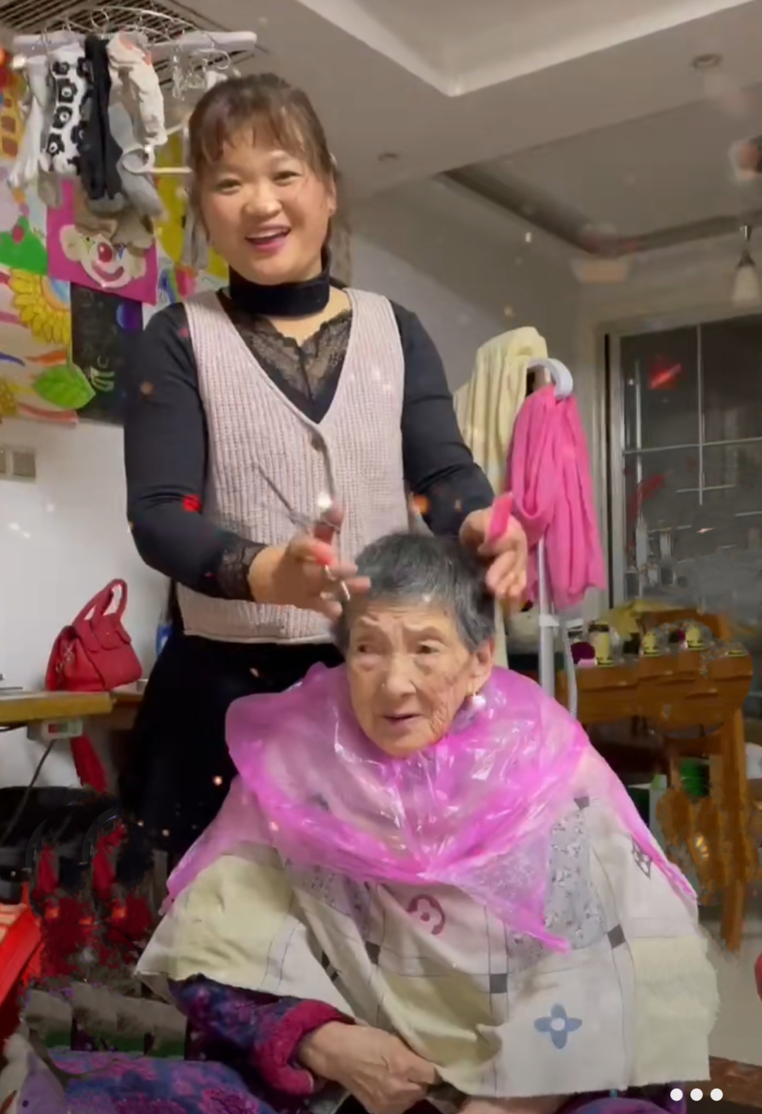 因为老人上楼下楼不方便,多年前冯艳萍就买来理发工具,当起了“家庭理发师”。“公爹公婆虽说没有生我养我之恩,可他们生了孩子他爸,今生能有幸成为一家人,就是注定的缘分。因为父母在家就在,一家人就会更加幸福美满。”