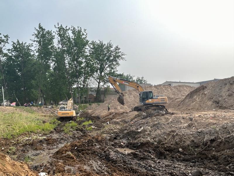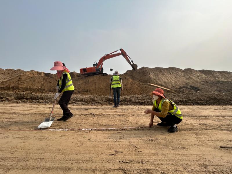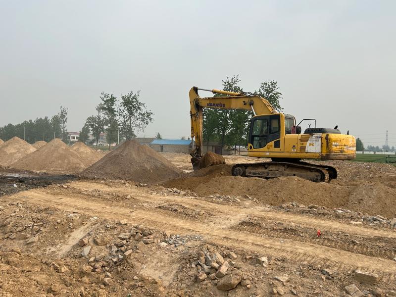 4月18日,记者在平安路东延工程施工现场看到,工程车来回穿梭作业,随处可见洒水车洒水抑尘,改善灰土含水量。在刘拱堂村东段,施工单位正进行水塘清淤工作;在大于庄至刘拱堂村段,多台挖掘机正进行码方、路槽开挖、挖除树根等作业,工作人员利用GPS定位工具进行道路放样作业,测量高程,确定里程桩,寻找正确桩号,以避免道路误差;在大于庄东段,挖掘机正进行回填作业;向前至郭庄村段,挖掘机正进行灰土拌和作业,郭庄村以东路基已经填筑完成;在大广高速分离式立交施工现场,工人们正在紧锣密鼓作业中。