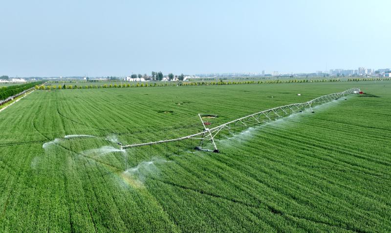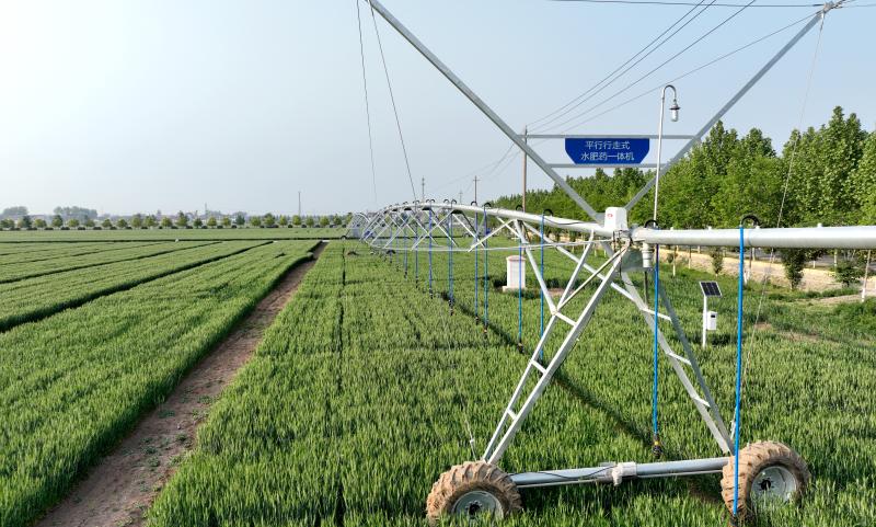 4月20日,记者在周口国家农高区郸城县高标准农田示范区看到,该县在高标准农田安装了中心支轴式喷灌、平行行走式喷灌、卷轴式喷灌、固定式喷灌等水肥一体化喷灌设施,犹如一条条“水龙”护卫着高标准农田,确保高标准农田实现旱能浇、能打药、可施肥,保丰收。②7