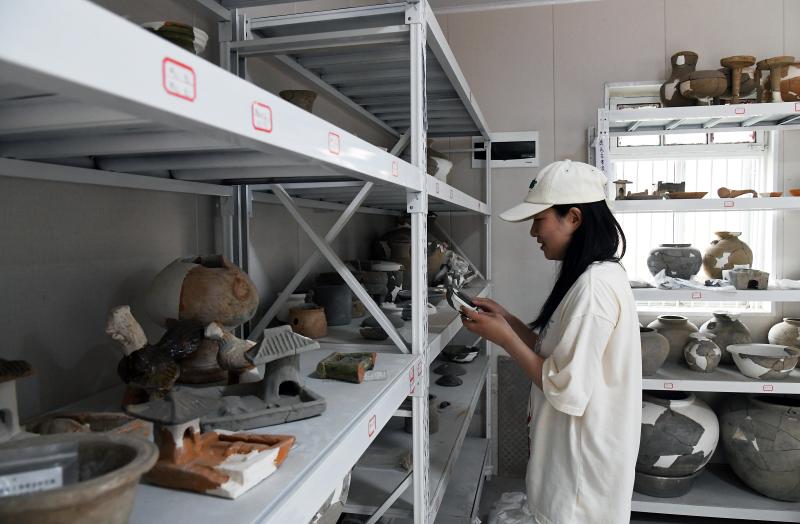 4月21日,平粮台大遗址保护中心标本间内一名技术人员查看文物修复情况。平粮台古城遗址文化内涵丰富,发现有仰韶、大汶口、龙山、二里头、商周、战国(楚)、两汉、宋等多时期文化遗迹,文物修复保护也成为该中心日常研究的重要课题。 (记者沈湛 摄)