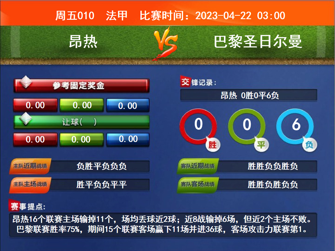 比赛时间:2023-04-22 03:00赛事提点:昂热16个联赛主场输掉11个,场均丢球近2球;近8战输掉6场,但近2个主场不败。巴黎联赛胜率75%,期间15个联赛客场赢下11场并进36球,客场攻击力联赛第1。